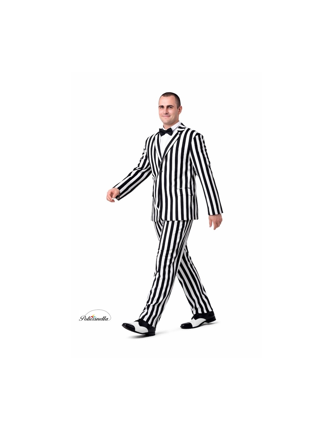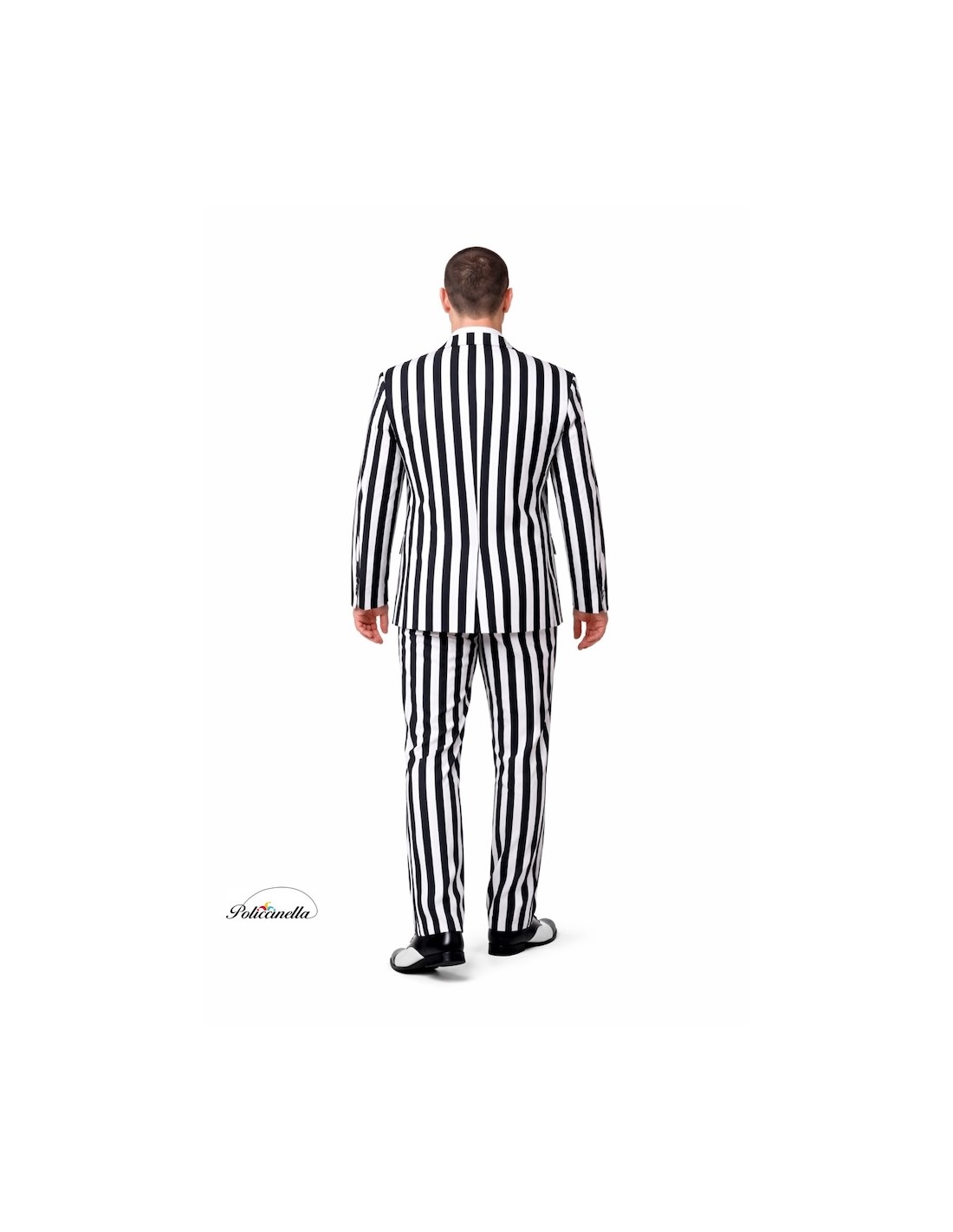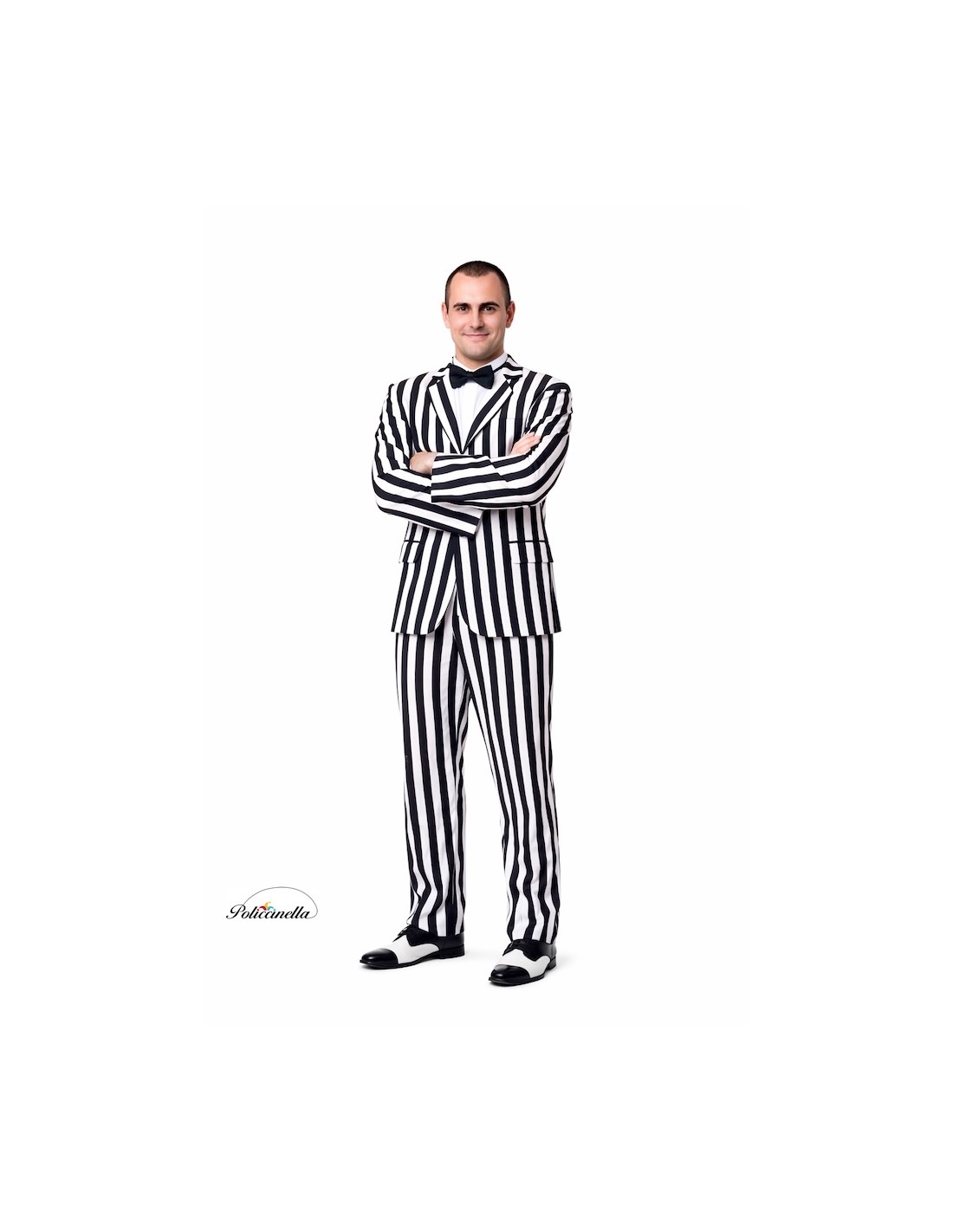 Versatile ed elegante, questo costume a righe da uomo ti permetterà di trasformarti in personaggi come il famoso personaggio cinematografico degli anni '80, con il suo inconfondibile completo a righe; nel padre di una bambina sinistra; in un gangster degli anni '20 o in un villain stravagante. Include una giacca stile americana a corpo dritto con chiusura frontale in velcro e pantaloni abbinati, entrambi realizzati in poliestere spesso di alta qualità con vita elastica. Sotto la giacca è integrata una falsa camicia in maglia con chiusura posteriore e fiocco al torace. Per completare il look, vengono aggiunti cravatta, farfallino e colletto a forma di pipistrello, pezzi in schiuma e velluto, completamente intercambiabili in base allo stile del personaggio che desideri interpretare. Un completo comodo, resistente e pieno di possibilità per spiccare in qualsiasi festa.