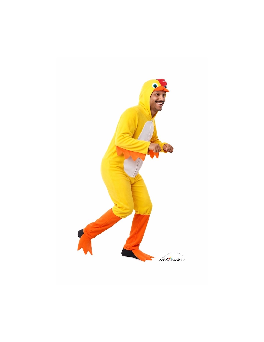Si tratta di una tuta intera realizzata in morbido poliestere al tatto vellutato, super soffice e coccolosa, con chiusura anteriore a zip nascosta e cappuccio incorporato. Becco, zampe e cresta sono realizzati in morbido punto di schiuma a macchina, per mantenere la forma e la struttura, mentre gli occhi sono realizzati in un fitto e rigido filtro attaccato al capo.