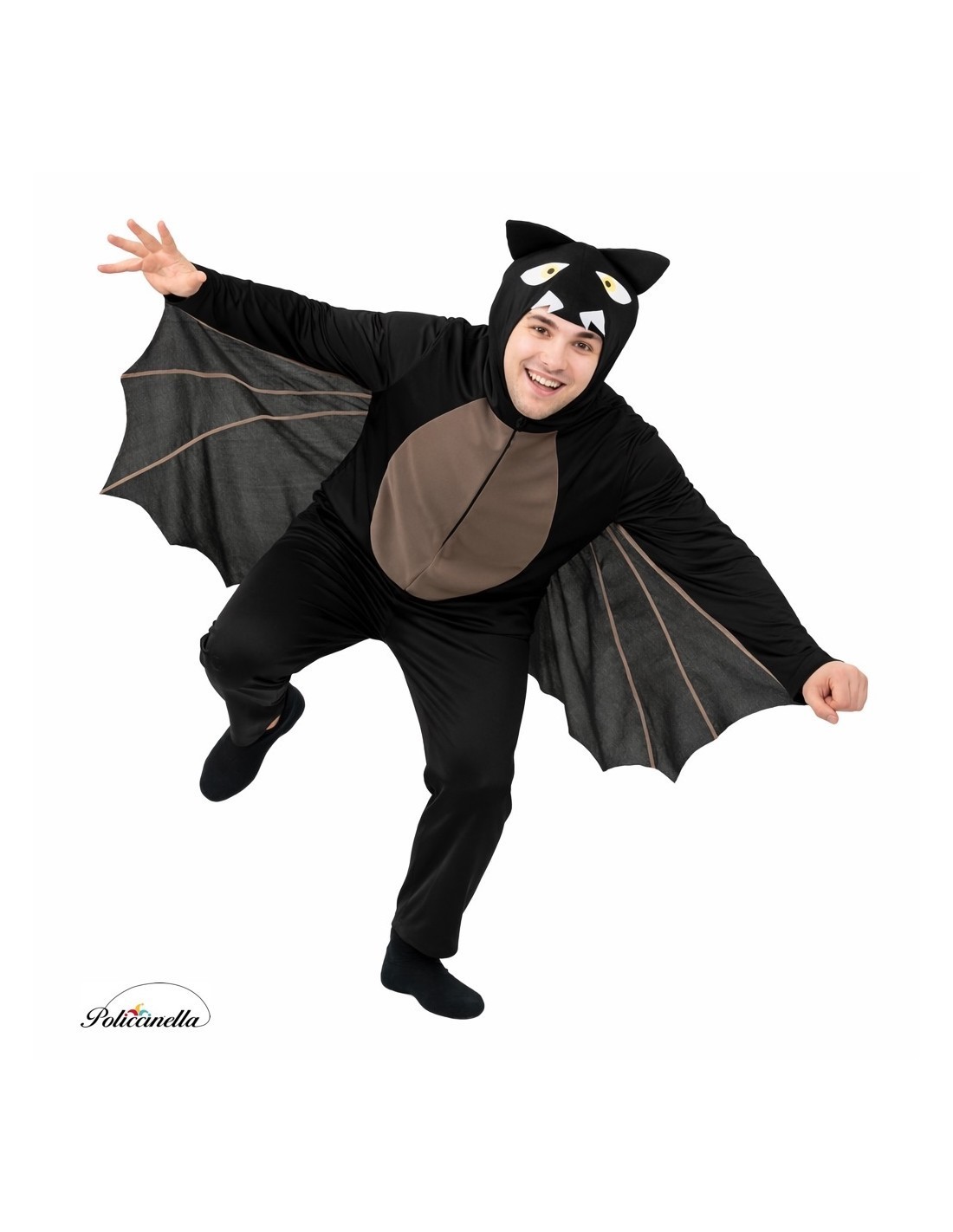 Questo costume originale consiste in una tuta intera realizzata in morbido tessuto semielastico a maglia con cappuccio incorporato. Il cappuccio è rivestito con un tessuto filtrante per maggiore consistenza e struttura. Presenta un elastico intorno alla testa per un migliore adattamento e sia gli occhi che i denti sono attaccati al tessuto, realizzati in tessuto filtrante denso. La tuta si chiude frontalmente con una cerniera invisibile e il pannello frontale è realizzato in poliestere felpato. Dalle maniche parte un tessuto a maglia che percorre i lati della tuta, formando le ali del pipistrello.