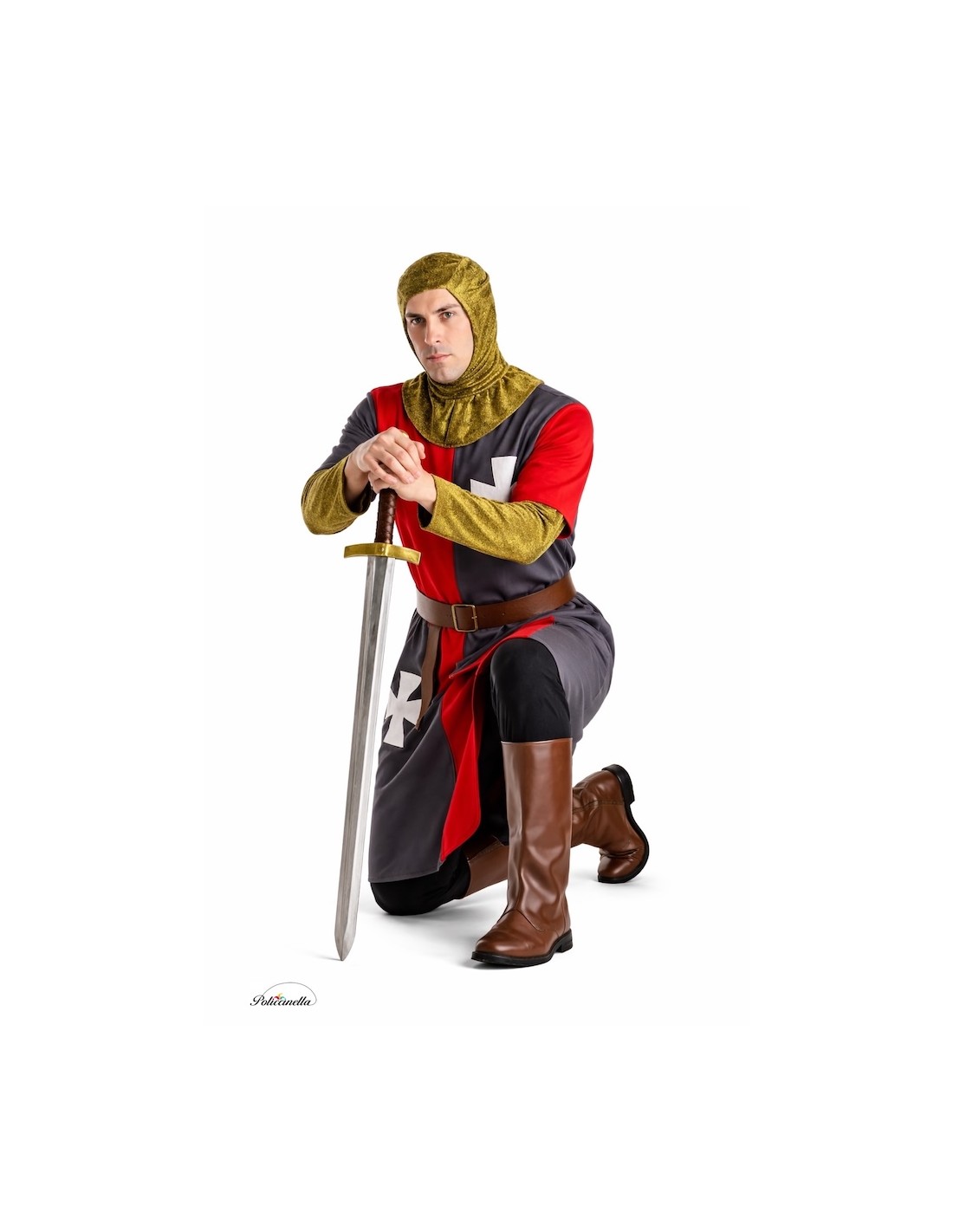 Descrizione del costume medievale: Si tratta di una giacca realizzata in poliestere dal tocco morbido e vellutato, di un vivace colore rosso combinato con grigio scuro. Incorpora due croci bianche realizzate in un fitto tessuto, cucite con precisione. Inoltre, include una cintura in poliestere che simula il cuoio di colore marrone scuro, dotata di una fibbia in plastica. Il costume è completato da un sottogiacca dorato in rete elastica, progettato per armonizzarsi con le maniche della giacca.