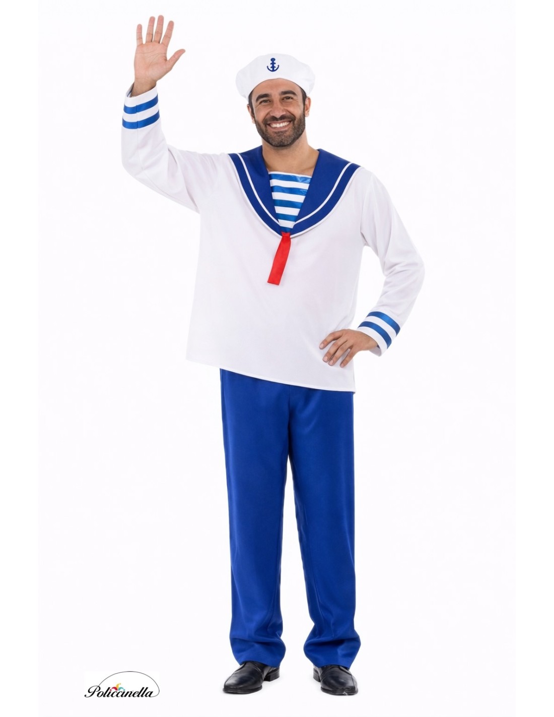 Questo costume include una maglietta realizzata in poliestere denso con un collo da marinaio, anch'esso in poliestere denso, decorato con nastri rossi di raso sotto. Incorpora una sezione a righe che simula un secondo capo, ma è cucita come parte integrante della stessa maglietta per creare quell'effetto distintivo. Il bordo delle maniche include due nastri di raso blu per un tocco caratteristico. Si completa con un pantalone in poliestere denso, con elastico in vita per una migliore vestibilità e piccola tasca interna. Infine, un bel cappello da marinaio strutturato per mantenere la forma.