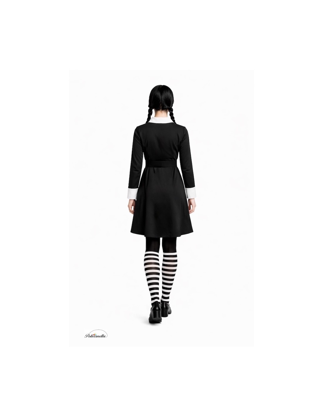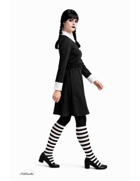 Scopri l'attrattiva singolare di questo costume, ideale per distinguerti a Halloween. Realizzato in un elegante tessuto a maglia, questo abito nero a maniche lunghe con polsini bianchi presenta una texture morbida e leggermente elastica. Il suo taglio classico valorizza la figura. Presenta un impeccabile colletto bianco con bottoni decorativi e una larga cintura che definisce la vita con uno stile gotico, completato da calze a righe nere e bianche.