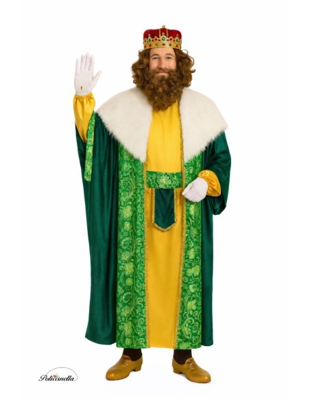 Sorprende come un vero Re Mago con questo lussuoso costume di alta qualità. Include un mantello di velluto morbido con collo in pelliccia sintetica, impreziosito da un davanti e delle maniche realizzati in un esquisito tessuto broccato tipo damasco e una delicata passamaneria dorata. La tunica di raso fluido, con comode polsini elastici e chiusura posteriore in velcro, conferisce un'aria regale ed elegante. Completano il look una spettacolare cintura in broccato e velluto con dettagli dorati, che si stringe con un fiocco. Ideale per sfilate, cortei e eventi indimenticabili. "La stampa del tessuto può variare leggermente rispetto a quella mostrata nella fotografia, mantenendo sempre la stessa qualità e stile."