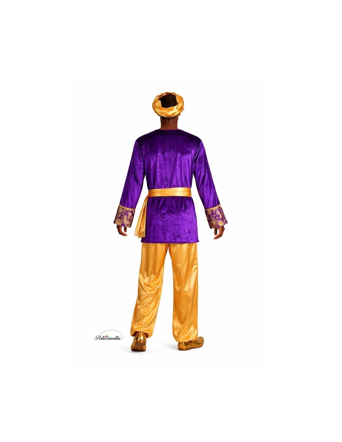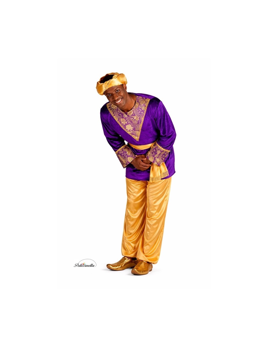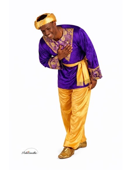 Questo costume da paggio brilla per la sua realizzazione di alta qualità e l'eleganza dei suoi dettagli. La giacca, in velluto viola dal tocco morbido, si adatta al collo con del velcro e presenta uno spettacolare fronte e maniche decorati con tessuto broccato tipo damasco e passamaneria dorata che conferiscono un'aria maestosa. I pantaloni, in raso dorato, hanno elastico in vita e alle caviglie per una vestibilità comoda, mentre la cintura, anch'essa in raso, è decorata con frange dorate che aggiungono distinzione. Il cappello a punta, in raso coordinato e coronato da una piuma, completa il set. Il gioiello del costume è senza dubbio il lussuoso broccato della giacca, che conferisce autenticità e nobiltà. Un abito morbido, vistoso e distinto, ideale per sfilate, presepi viventi e celebrazioni natalizie piene di tradizione. "L' stampa del tessuto può variare leggermente rispetto a quella mostrata nella fotografia, mantenendo sempre la stessa qualità e stile".
