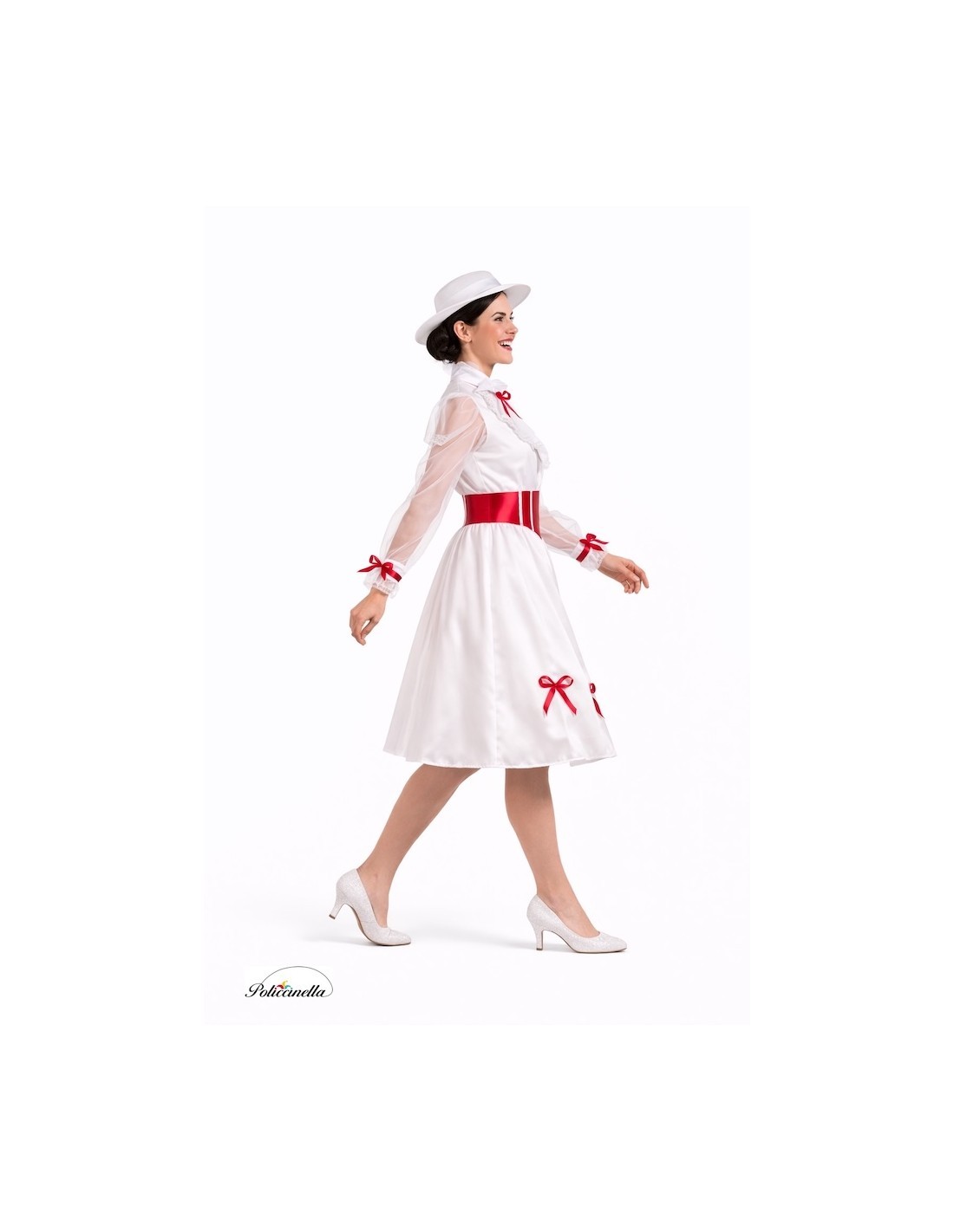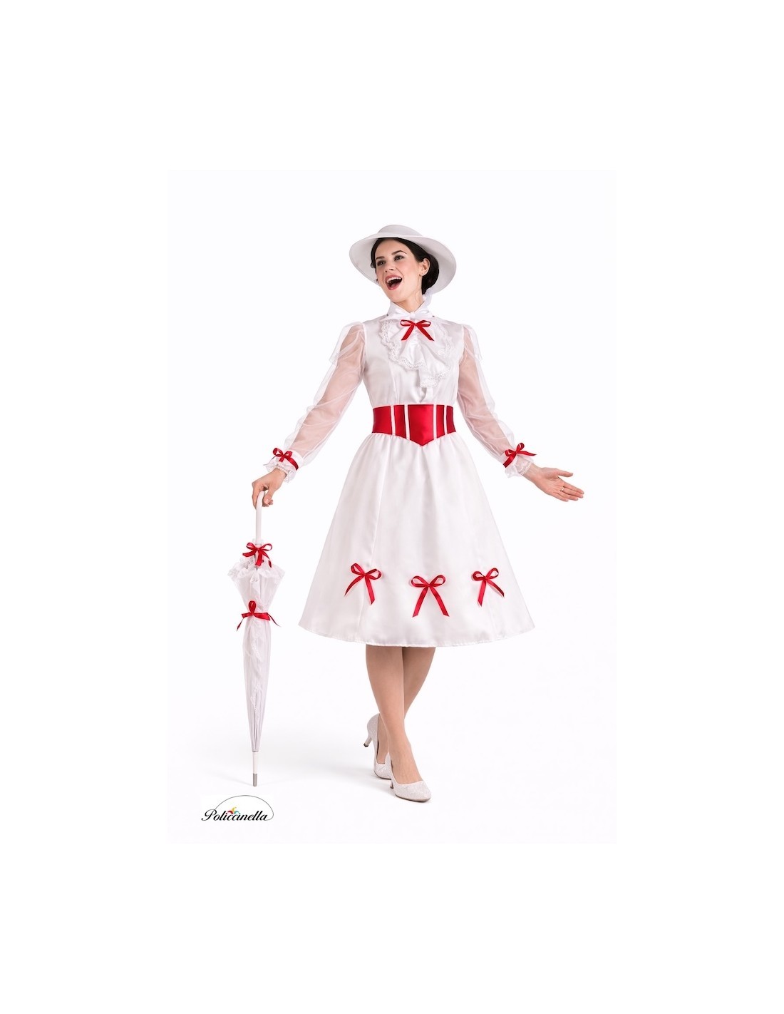 Un design elegante e pieno di fascino. Il vestito è realizzato in morbido tessuto di maglia semi-elastico, con chiusura al collo tramite velcro e elastico in vita da cui parte una gonna ampia in raso fitto con grande movimento. Le maniche, in chiffon semitrasparente, donano leggerezza e sono decorate con delicati fiocchi rossi che esaltano anche polsini, collo e orlo della gonna. Sul petto, un dettaglio in pizzo bianco aggiunge distinzione. Per regolare, include una cintura in raso foamizzato con fiocco posteriore. Il set si completa con un cappello anch'esso foamizzato, per mantenere la sua forma e struttura impeccabile, decorato con fiocchi rossi e un elegante velo di tulle integrato. Un costume di grande fattura, dettagliato e con una finitura di qualità.
