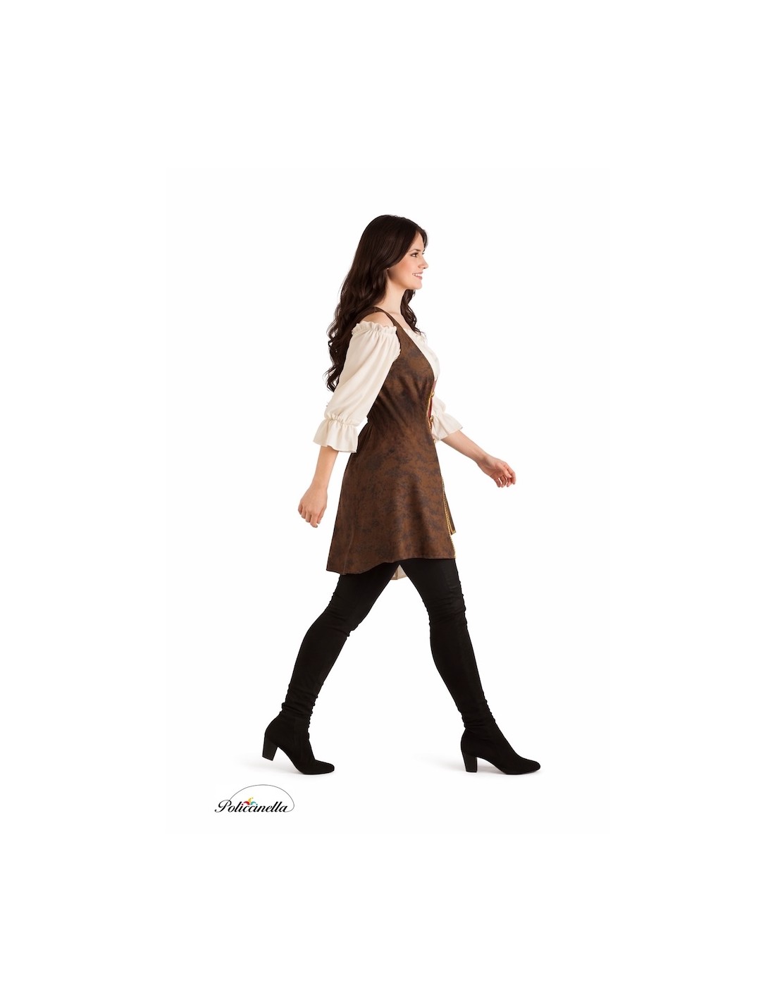 Giacca tipo frac con texture simil velluto a coste e stampa che imita il cuoio invecchiato. Camicia integrata in maglia semielastica, arricciata sul collo e sul petto, con maniche a sbuffo e volant. Gilet effetto taffetà, decorato con bottoni dorati e passamaneria. Le spalle rimangono suggestive e scoperte. Pantaloni abbinati in morbida maglia, con elastico in vita e tasca interna. Un completo confortevole e ricco di carattere pirata.