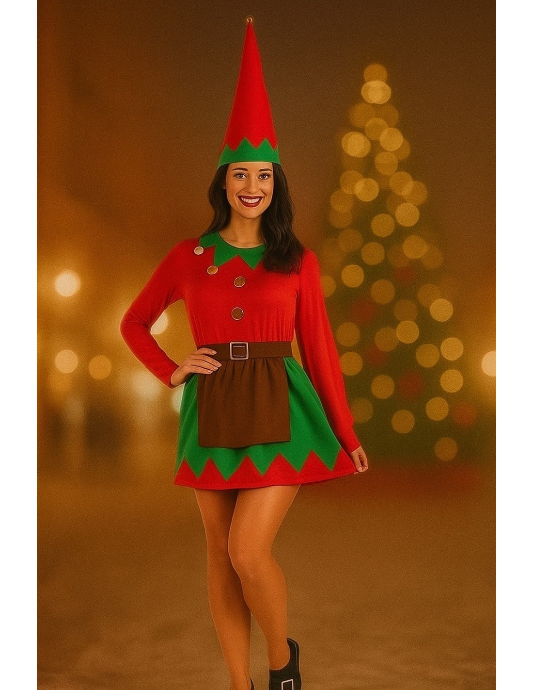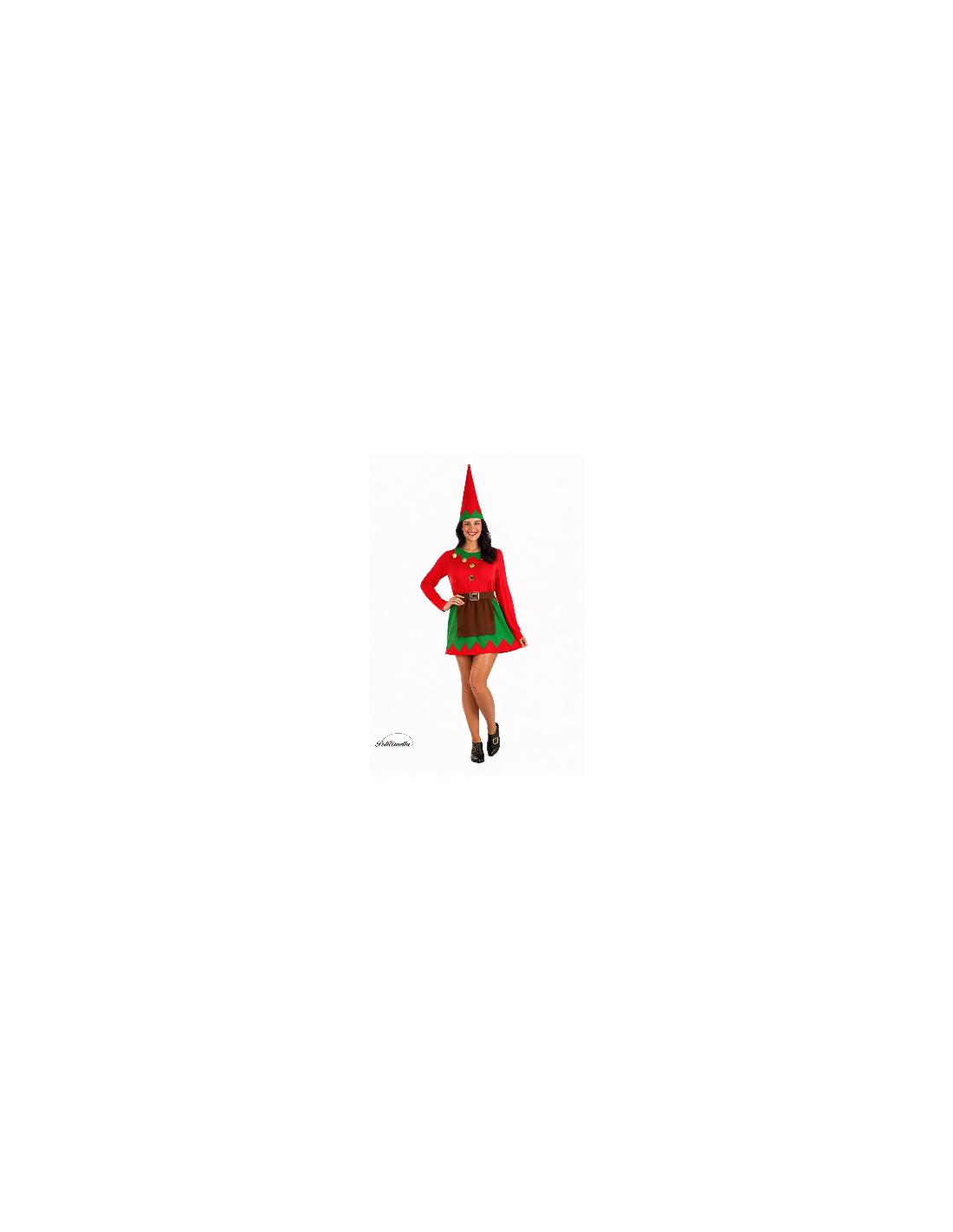 Incantevole vestito in maglia semielastica, morbido al tatto e con vita arricciata per una vestibilità favorevole. Colletto e gonna con texture vellutata, decorati con applicazioni dorate a forma di bottone che aggiungono un tocco luminoso e festoso. Il grembiule marrone, cucito alla gonna, aggiunge un accenno tradizionale al design. Include una cintura di feltro con fibbia dorata fiammeggiante e chiusura in velcro, e un cappello a forma conica con bordo in velluto e decorazione dorata sulla punta. Un set di alta qualità per un'elfa indimenticabile.