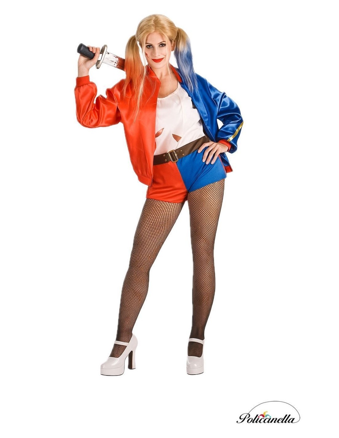 Questo originale costume fonde lo stile sportivo con un tocco misterioso. La giacca tipo bomber è realizzata in morbido raso, con nastro dorato sulle maniche e una maglietta interna integrata in maglia semi-elastica, ottenendo l'effetto di due capi in uno solo, comodo e leggero. I pantaloni, anch'essi in maglia a macchina, hanno un elastico posteriore per una vestibilità perfetta. Sul davanti, un pezzo di poliestere su base di TNT simula una cintura in pelle, decorata con una fibbia dorata di plastica dal finish metallico e quattro applicazioni che imitano ferramenta, conferendo un'aria audace e distintiva all'insieme.