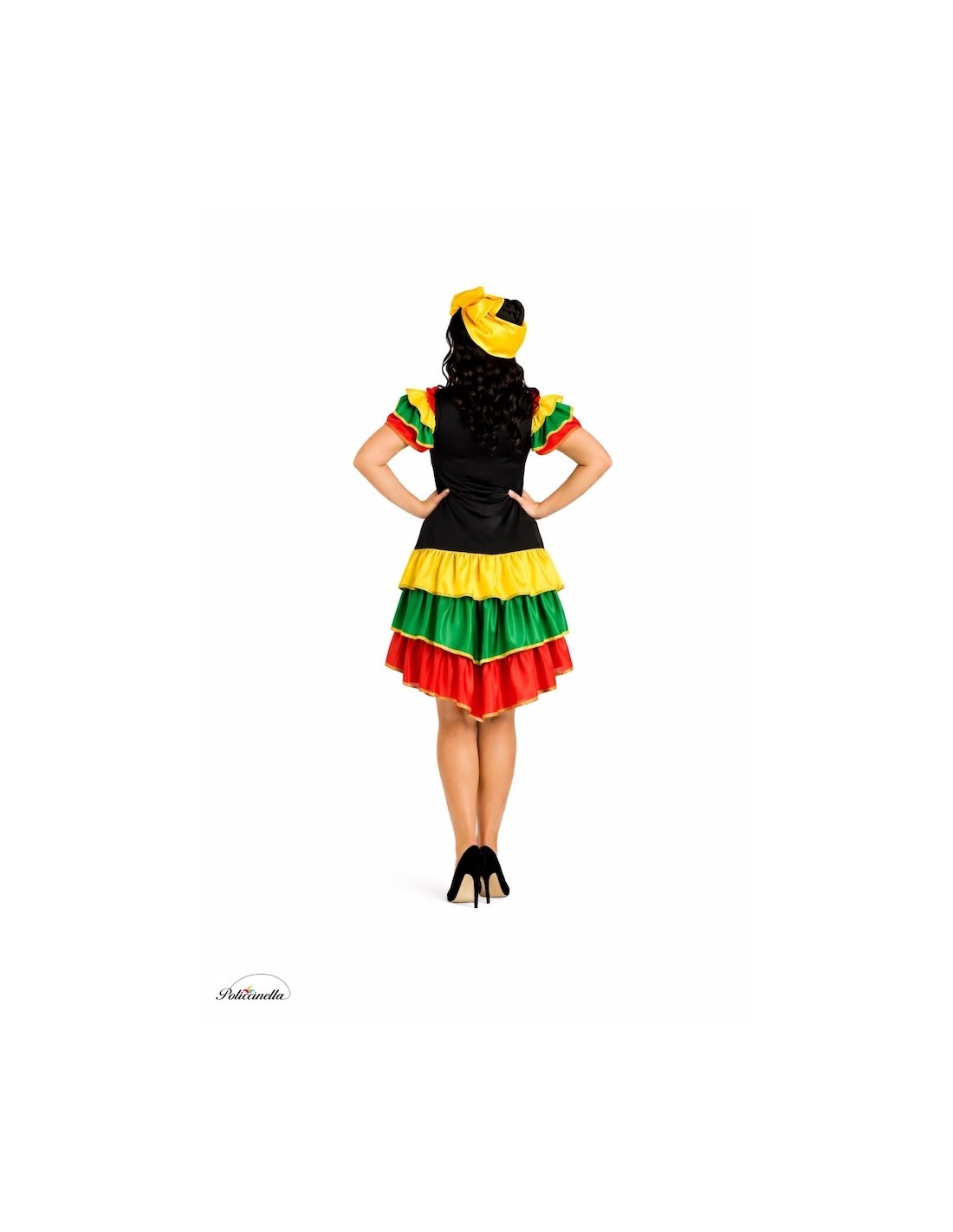 Colorato ed elegante costume da rumbera composto da un vestito a taglio dritto con fondo asimmetrico, più lungo dietro, realizzato in morbido punto di macchina semi-elastico. Leggero, comodo e lusinghiero, è decorato con allegre volants sul collo, sulle maniche e sul fondo, realizzati in morbido raso dai colori vivaci e rifiniti con nastri dorati. Include una bandana coordinata per la testa dello stesso tessuto dei volants. Un design vistoso e adattabile a diverse taglie, ideale per sfilate, spettacoli, Carnevale o feste piene di ritmo e allegria.