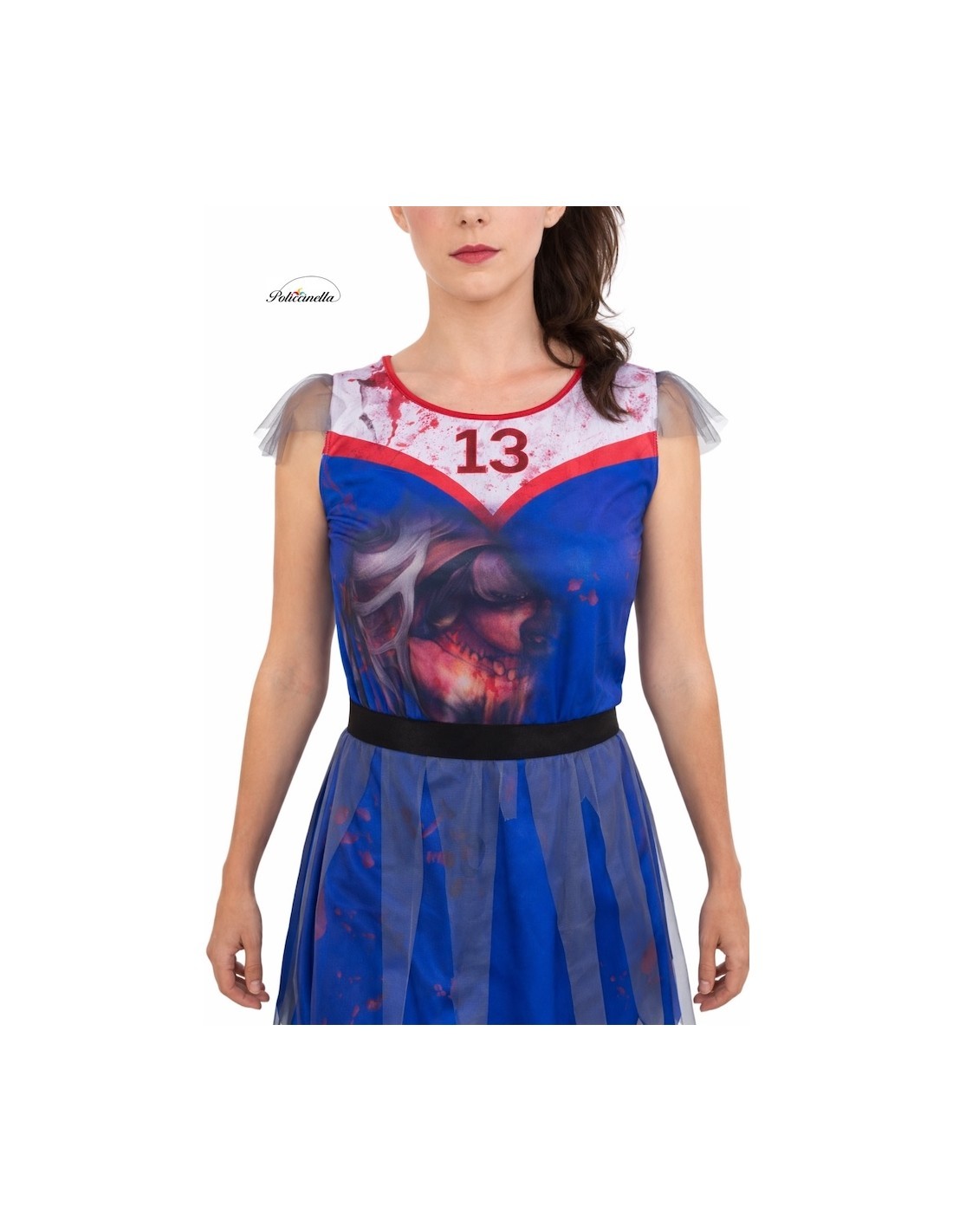 Questo costume da cheerleader zombie è composto da un vestito blu elettrico realizzato in maglia a macchina con un design stampato digitalmente. Il vestito si chiude sulla parte posteriore con un sistema di velcro e include una cintura in vita anch'essa chiusa con velcro e decorata con strisce di tulle che cadono sulla gonna. Inoltre, presenta un dettaglio decorativo di tulle grigio sulle spalline. Il costume è completato da calzettoni lunghi che simulano schizzi di sangue e tre strisce blu vicino alla parte superiore.