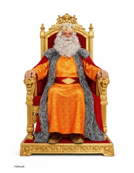 Questo maestoso costume del Re Melchior trasmette la grandezza e la solennità di un monarca dell'Oriente grazie alla ricchezza dei suoi tessuti e dei suoi dettagli. La giacca lunga, realizzata in raso rosso con delicato stampato dorato, conferisce un'aria regale e luminosa. Sopra di essa si posa un'imponente mantella di velluto, rifinita con una densa pelliccia riccioluta grigia che esalta l'eleganza e la distinzione dell'insieme. La cintura di velluto, decorata con un dettaglio frontale e chiusura in velcro sul retro, assicura comfort senza perdere la nobiltà nell'aspetto. L'abito si completa con copri-scarpe dorati tipo babucce, realizzati in schiuma per mantenere la loro struttura impeccabile e fornire un finitura uniforme. Un costume di alta qualità, ideale per sfilate e rappresentazioni che richiedono uno stile autentico e distintivo. "Il motivo del tessuto può variare leggermente rispetto a quello mostrato nella fotografia, mantenendo sempre la stessa qualità e stile."