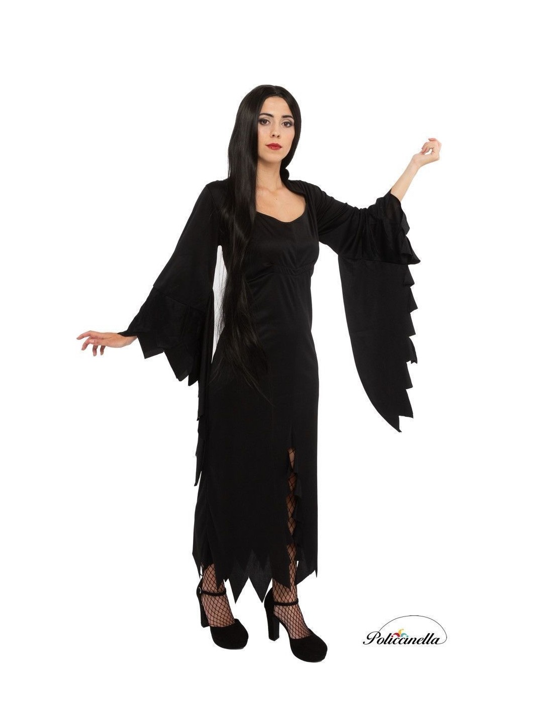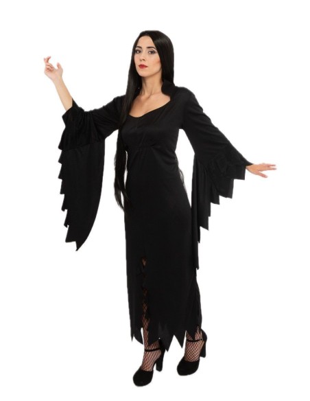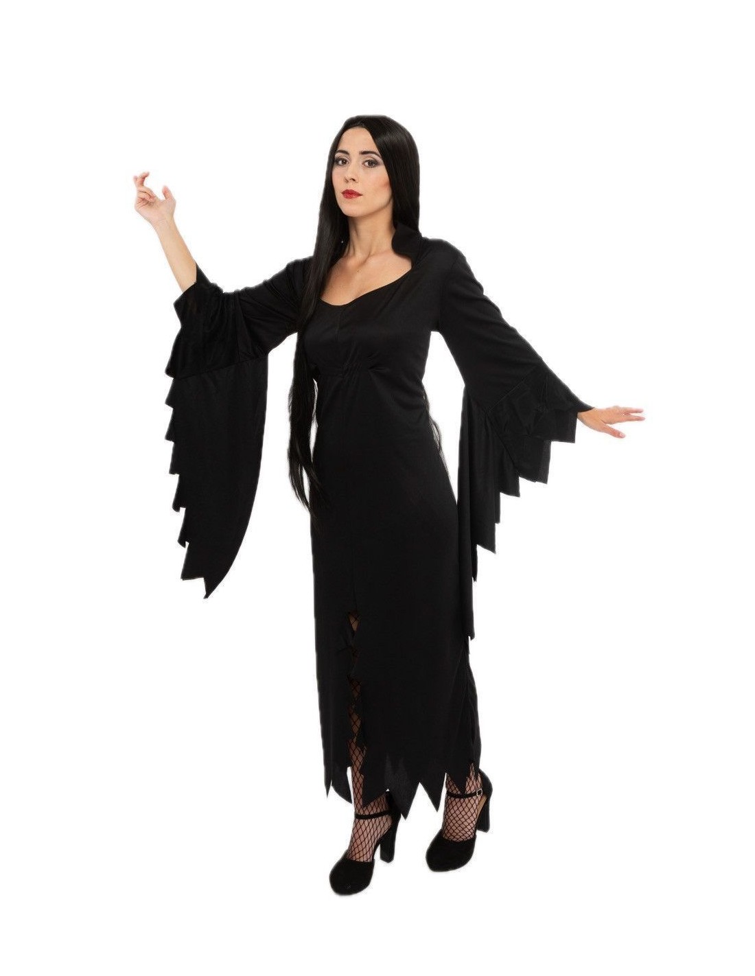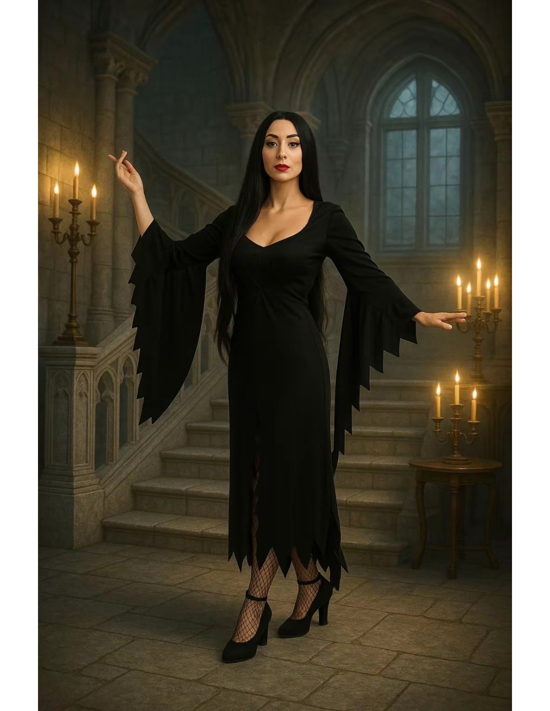 Questo vestito, realizzato in maglia semielastica, presenta uno scollo a forma di mezzo cuore con patta al collo e un'apertura frontale fino al ginocchio. Le maniche, di media altezza, hanno un sopramanica che arriva quasi alle caviglie. Il vestito ha una cucitura sotto il seno per esaltare la figura e viene fornito con una cintura che si adatta al contorno attraverso un sistema di velcro.