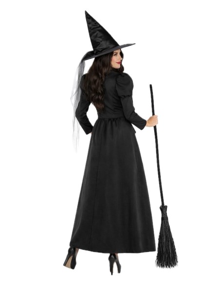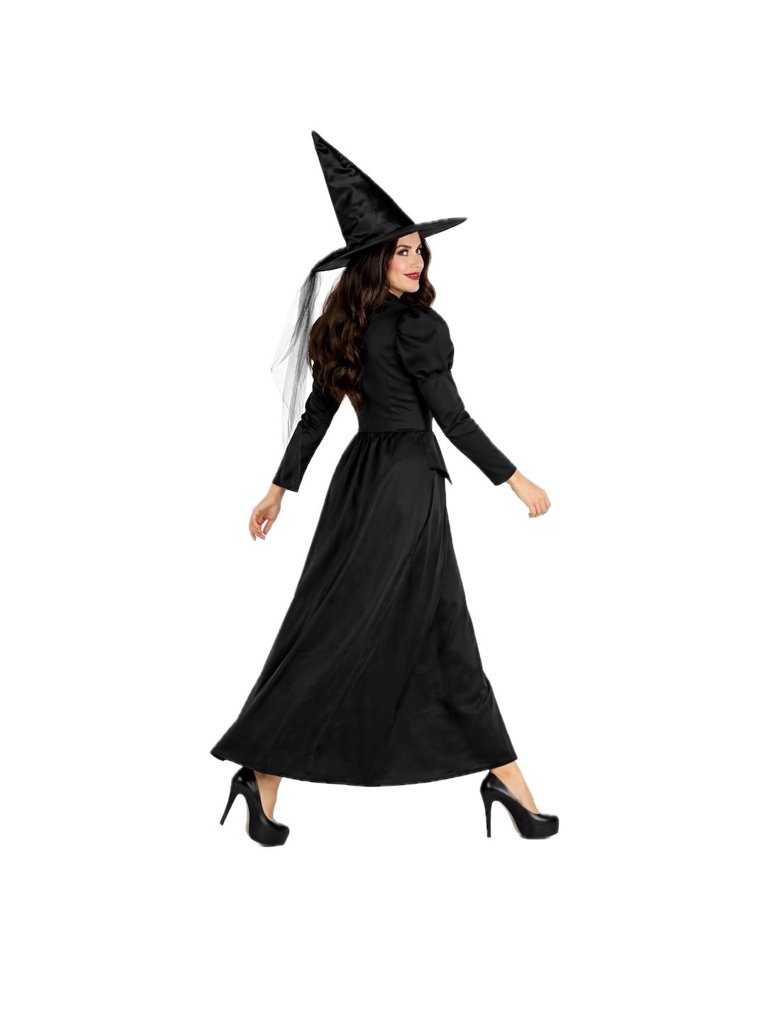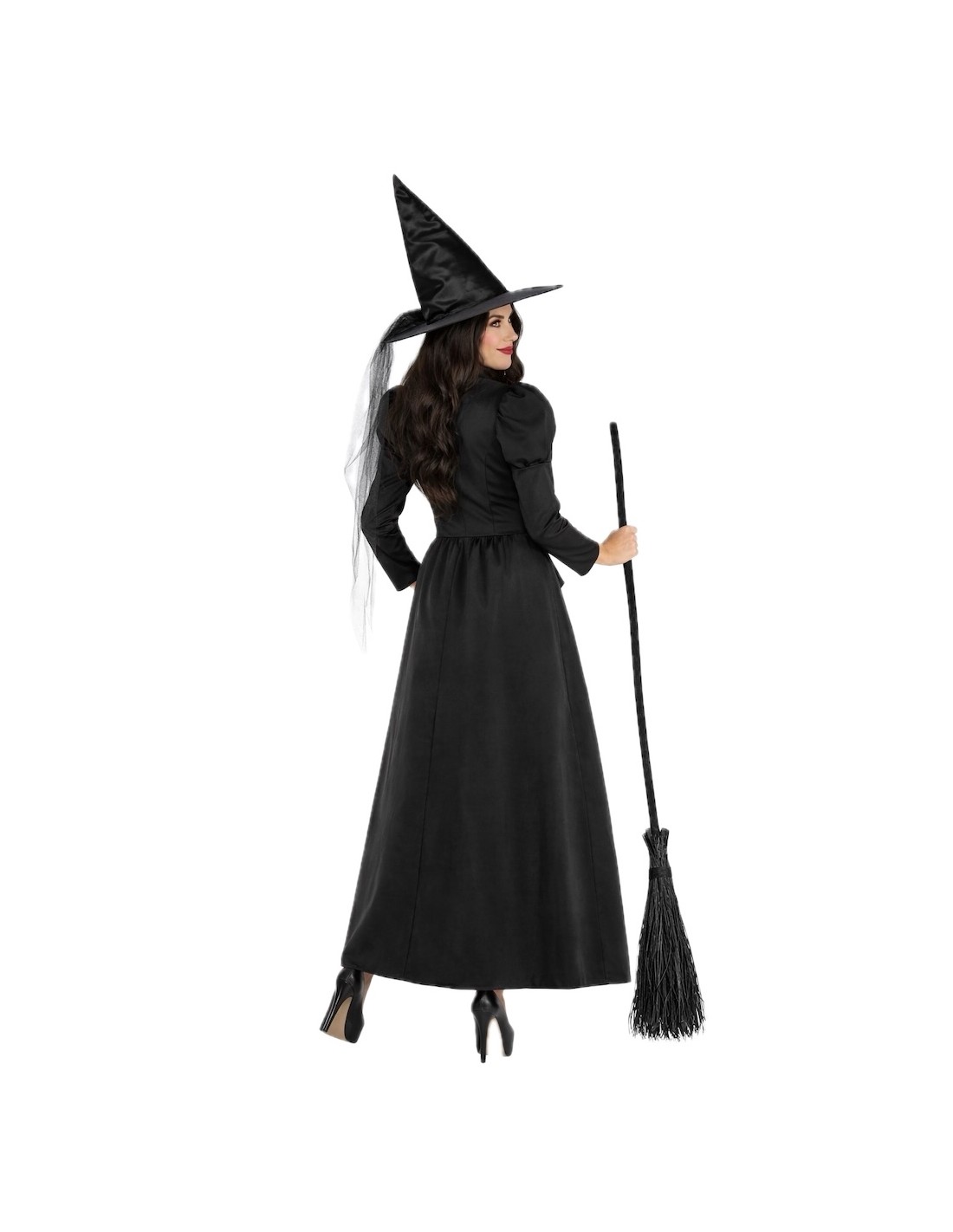 Un insieme che combina mistero e distinzione. Il vestito, realizzato in morbido e fitto poliestere, presenta un design lungo con vita elastica che si adatta comodamente alle taglie dalla 36 alla 44. Le sue maniche a palloncino e i bottoni decorativi frontali apportano un tocco classico, mentre il collo alto e la chiusura con velcro sulla schiena garantiscono un finish impeccabile. L'insieme è completato da un resistente cappello di raso, con cerchio interno che mantiene la forma e tulle nero che scende fino alla vita. La sua punta leggermente curva aggiunge un tocco grazioso e unico, ideale per feste a tema o per Halloween.