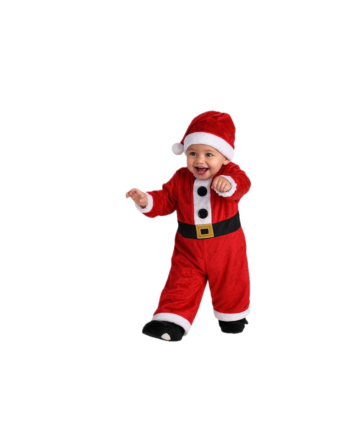 Lo spirito natalizio nella sua versione più tenera! Questa tutina intera è realizzata in velluto fitto e morbido, perfetta per mantenere il bambino comodo e caldo. Include una cintura e copri-scarpe integrati, con cerniera sul retro per facilitare il cambio. La fibbia è imbottita per un tocco più vistoso, e sul petto ha due cerchi di feltro che simulano pon pon. Si completa con il classico cappello di Babbo Natale con pon pon bianco. Di grande qualità ed eccellente fattura. Ideale per celebrazioni e foto indimenticabili!