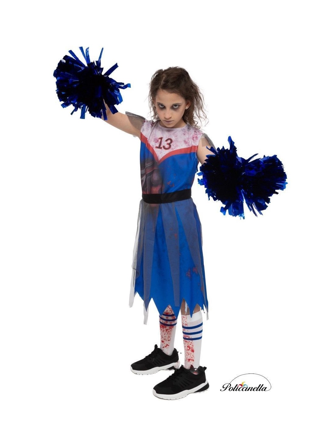 Questo costume di cheerleader zombie è composto da un vestito blu elettrico realizzato in maglia a macchina con un design stampato digitalmente. Il vestito si chiude sulla parte posteriore con un sistema di velcro e include una cintura in vita che si chiude anch'essa con il velcro ed è decorata con strappi di tulle che cadono sulla gonna. Inoltre, ha un dettaglio decorativo di tulle grigio sulle spalline. Il costume è completato da calzettoni lunghi che simulano schizzi di sangue e tre strisce blu vicino alla parte superiore.