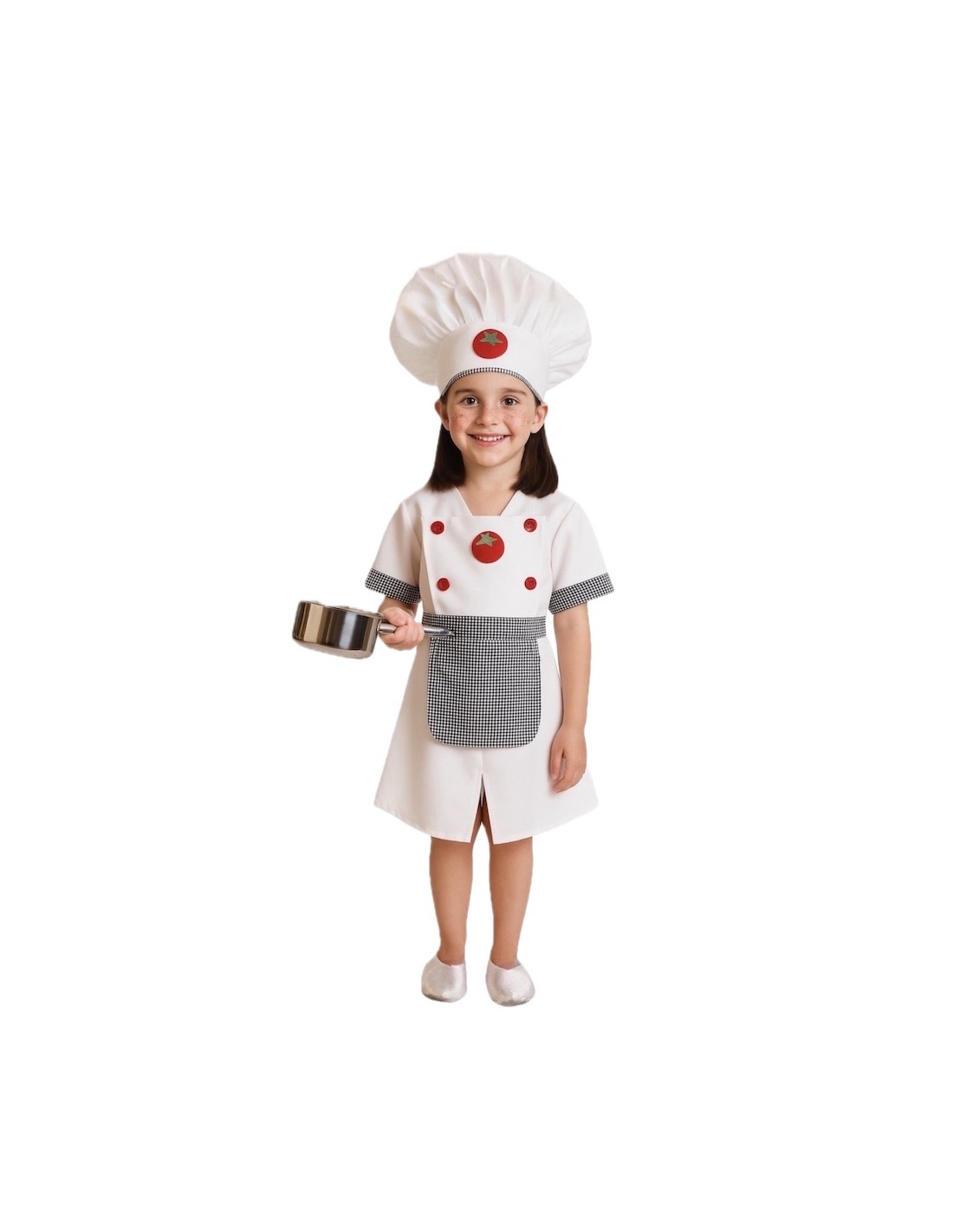 Questo costume, realizzato in poliestere denso, è composto da un vestito con una grande tasca frontale, decorata con quattro bottoni. Inoltre, include un pezzo di filtro rigido a forma di pomodoro come decorazione. Le maniche sono corte, decorate con una striscia a quadretti vichy, e presenta un'apertura frontale all'altezza della gonna. Il costume è completato dal caratteristico cappello da cuoca, realizzato nello stesso materiale e con la stessa decorazione del vestito, e un grembiule a quadretti vichy che si annoda in vita con un fiocco.