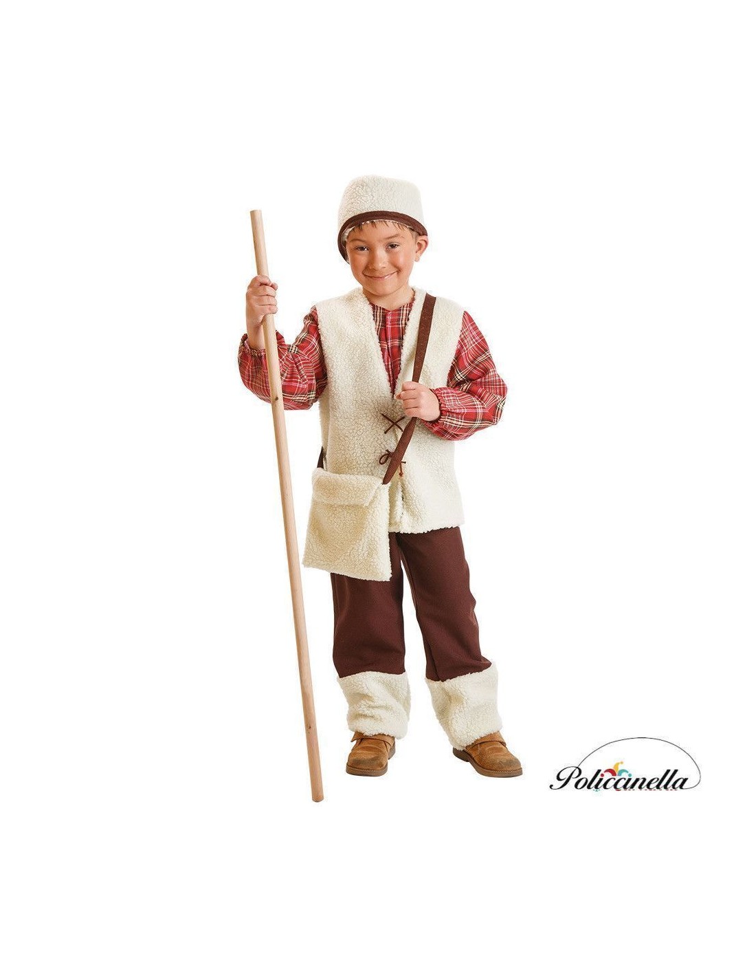 Costume da pastore composto da camicia con gilet integrato, realizzato in un'unica pezza. La camicia è realizzata in poliestere denso (simile a una tovaglia) mentre il gilet simulato sulla parte anteriore presenta un tessuto in stile shearling con fiocco decorativo a zigzag. La parte posteriore del gilet è realizzata in maglia per un maggiore comfort. I pantaloni, in maglia semi-elastica, hanno la vita elastica e le caviglie decorate con dettagli in shearling coordinati. Include cappello e bisaccia coordinati, completando l'insieme in modo coerente dal punto di vista estetico.
