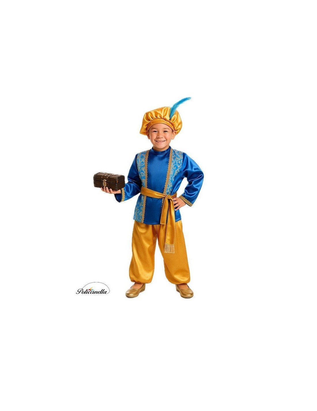 Tradizionale costume da paggetto, elegante e ricco di dettagli. Include una camicia in morbido raso con chiusura a strappo sul retro del collo, decorata sul davanti con stoffa dall'effetto broccato dorato e con delicata passamaneria, presente anche sulle maniche. Il completo si completa con un pantalone con elastico in vita e alle caviglie, una cintura e il caratteristico cappello decorato con piuma e elastico posteriore per una comoda vestibilità, realizzati nello stesso tessuto coordinato. Un abito appariscente e comodo per l'occasione!