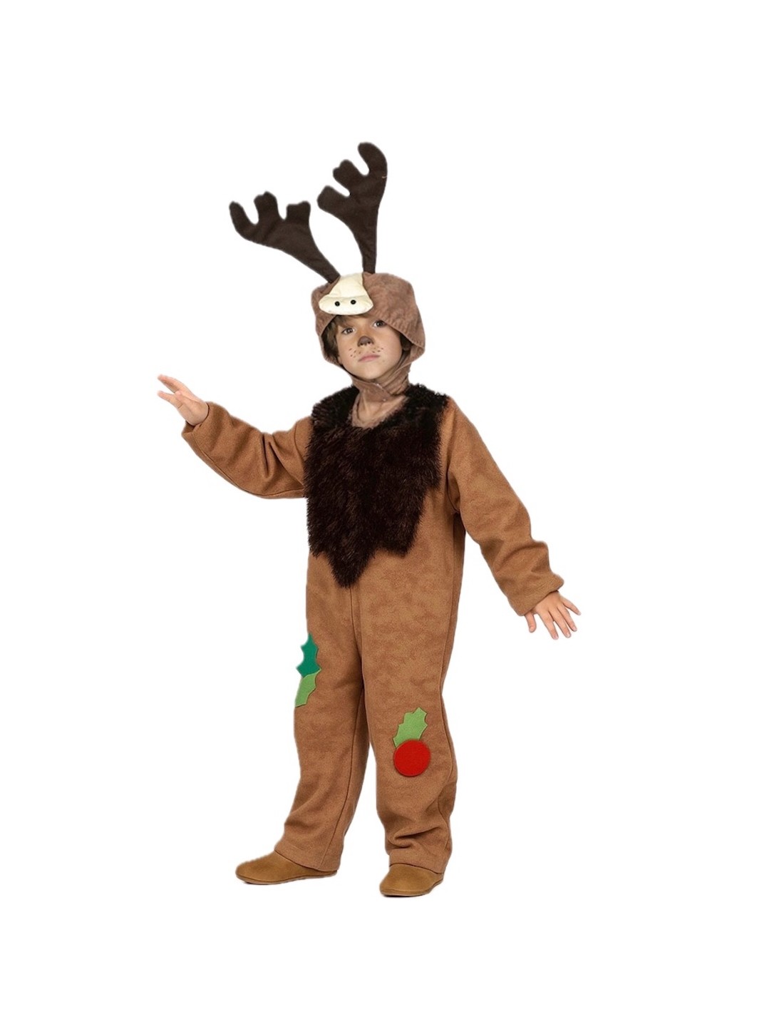 Questo incantevole costume da renna per bambini è realizzato in un tutone intero dal morbido tocco amelocotonado, con chiusura a zip sul retro per facilitare l'indossamento. Sul davanti spicca una pelliccia sintetica riccia molto morbida, che conferisce realismo e contrasto all'insieme. Le gambe presentano applicazioni natalizie in feltro fitto, cucite con cura. Il cappuccio separato assicura una perfetta vestibilità grazie all'elastico sul collo e ai chiusure a strappo, e include all'interno una fascia per garantire stabilità e mantenere dritti i corna in feltro. Il muso, realizzato in velluto spugnoso, conferisce volume ed un attraente effetto tridimensionale. Un design curato fin nei minimi dettagli, resistente e confortevole, ideale per spettacoli scolastici, celebrazioni natalizie ed eventi per bambini.