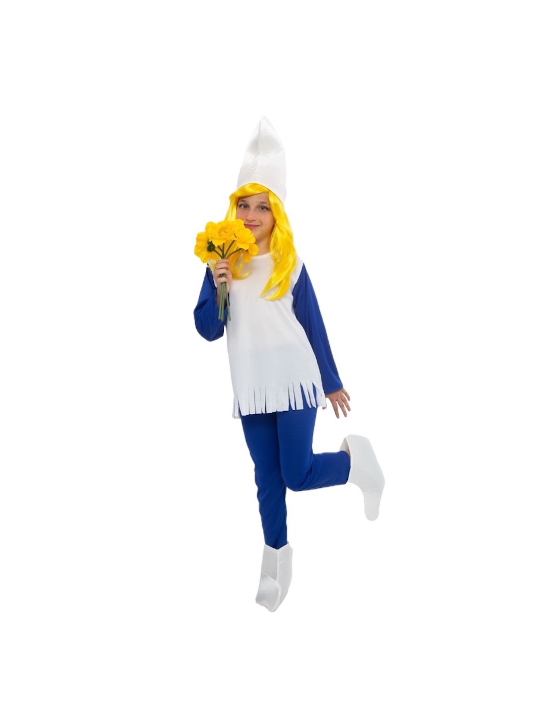 Questo divertente costume, realizzato in un morbido tessuto a maglia leggermente elastico, è composto da una maglietta lunga con decorazioni sul fondo a frange e chiusura al collo con sistema in velcro, pantaloni con elastico in vita, copriscarpe a forma di stivaletto realizzati in schiuma per evitare deformazioni e un cappello a forma curva dello stesso materiale dei copriscarpe, in modo che rimanga eretto e non cada.