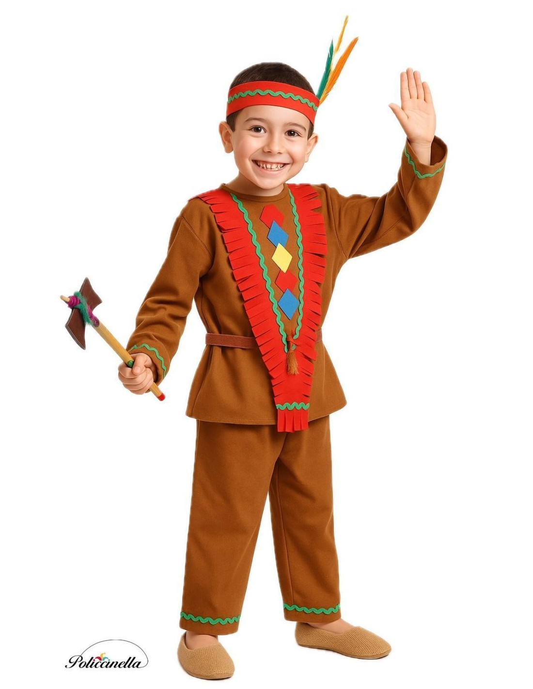 Questo costume da indiano, realizzato in morbido poliestere, è composto da una maglietta lunga con petto di un vivace colore rosso che arriva fino alla parte inferiore della stessa. La maglietta è decorata con frange e colori caratteristici del personaggio, così come con una striscia verde. Il costume ha una chiusura a strappo nella parte posteriore del collo. Include un pantalone con elastico in vita e una piccola tasca interna. Si completa con un nastro con tre piume dai colori vivaci e con elastico nella parte posteriore per adattarsi alla testa.
