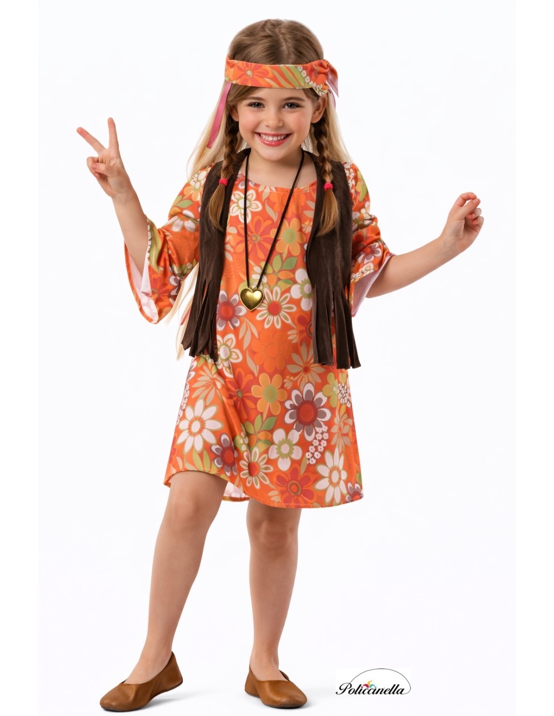Questo colorato vestito, realizzato in morbido tessuto a maglia, presenta una chiusura al collo sul retro. Nella parte anteriore, è stato integrato un gilet dal tatto vellutato sopra l'indumento stesso, creando l'effetto di due pezzi. Il gilet si chiude sul davanti con dei lacci e presenta allegri frange lunghe e un nastro per la testa, tipici di questo tipo di design.