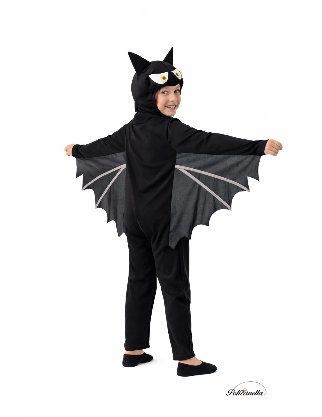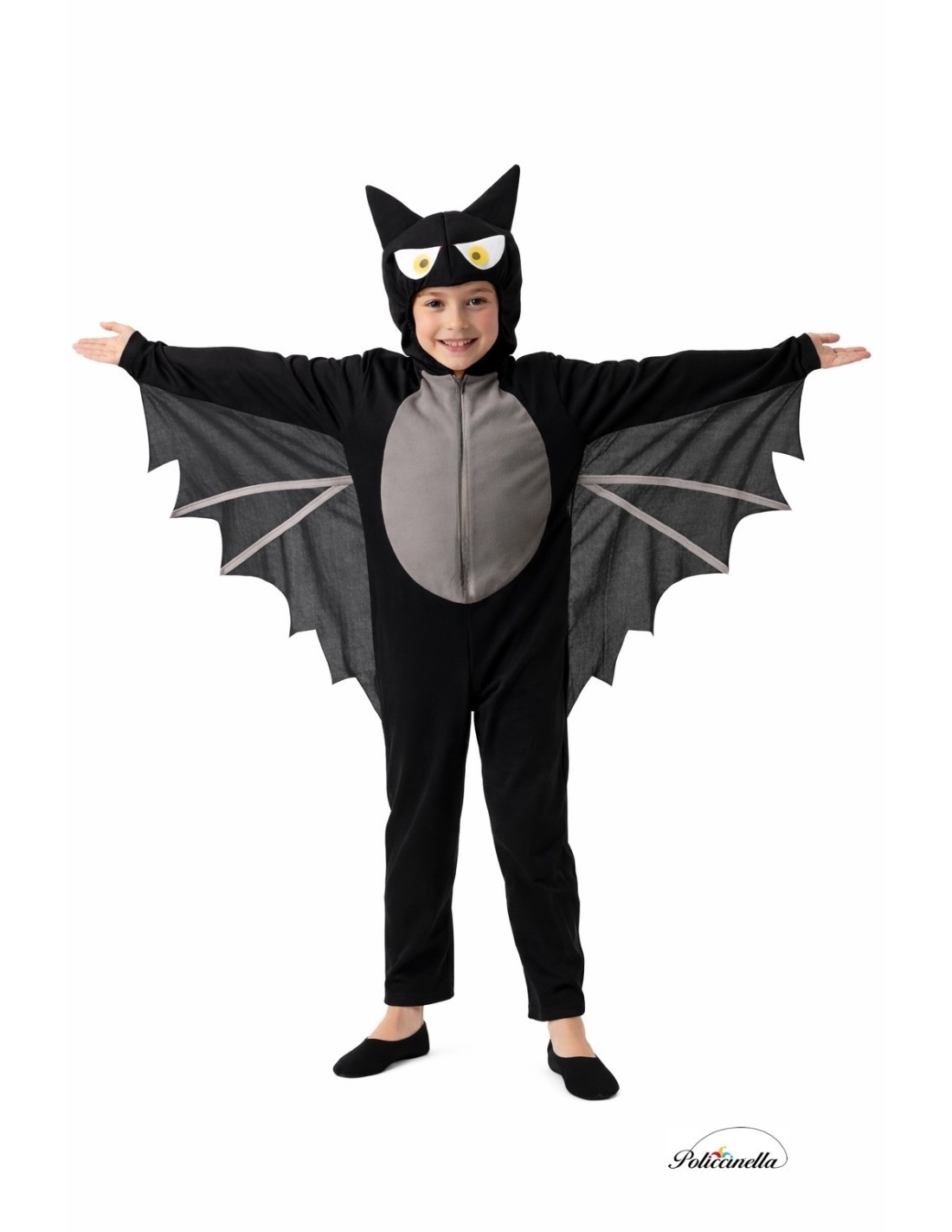 Questo costume originale consiste in una tuta intera realizzata in morbido tessuto semielastico a maglia con cappuccio incorporato. Il cappuccio è rivestito con un tessuto filtrante per maggiore consistenza e struttura. Presenta un elastico intorno alla testa per un migliore adattamento e sia gli occhi che i denti sono attaccati al tessuto, realizzati in tessuto filtrante denso. La tuta si chiude frontalmente con una cerniera invisibile e il pannello frontale è realizzato in poliestere felpato. Dalle maniche parte un tessuto a maglia che percorre i lati della tuta, formando le ali del pipistrello.