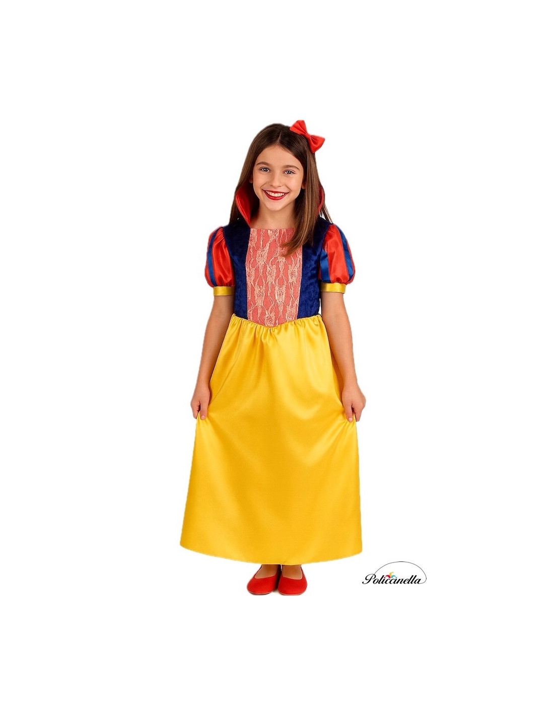 Questo costume combina la magia delle fiabe classiche con una confezione di grande qualità. L'abito, con vita arricciata e chiusura posteriore in velcro, presenta un elegante collo a scatola. Il petto, in morbido raso e velluto, è decorato con un delicato pizzo, mentre le maniche a sbuffo sono adornate con nastri di raso blu elettrico abbinati al davanti. Il retro, in punto di macchina semi-elastico, garantisce comfort e adattabilità. La gonna, in raso denso e dal bellissimo cadere, conferisce un'aria maestosa. Il gioiello del costume è il suo collo alto e spumoso, che rimane dritto e conferisce un portamento regale inconfondibile e infine, il completo si completa con la classica tiara con fiocco rosso, marchio distintivo del personaggio. Un vestito comodo, resistente e pieno di fascino, ideale per trasformarsi nella principessa più iconica al Carnevale o alle feste a tema.