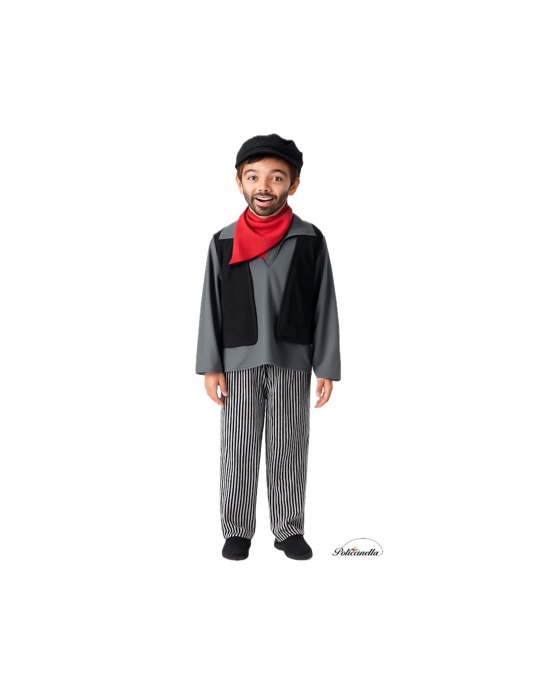 Completo costume da spazzacamino con maglietta in morbido tessuto a maglia semi-elasticizzata e gilet integrato in tessuto ammollo, che dà l'effetto di due capi in uno. Pantaloni abbinati con elastico in vita per una maggiore comodità e piccola tasca interna. Include fazzoletto al collo e berretto, entrambi in tessuto ammollo; il berretto è arricciato con visiera spugnosa per mantenere la sua forma. Un completo comodo e ricco di dettagli per un look autentico.