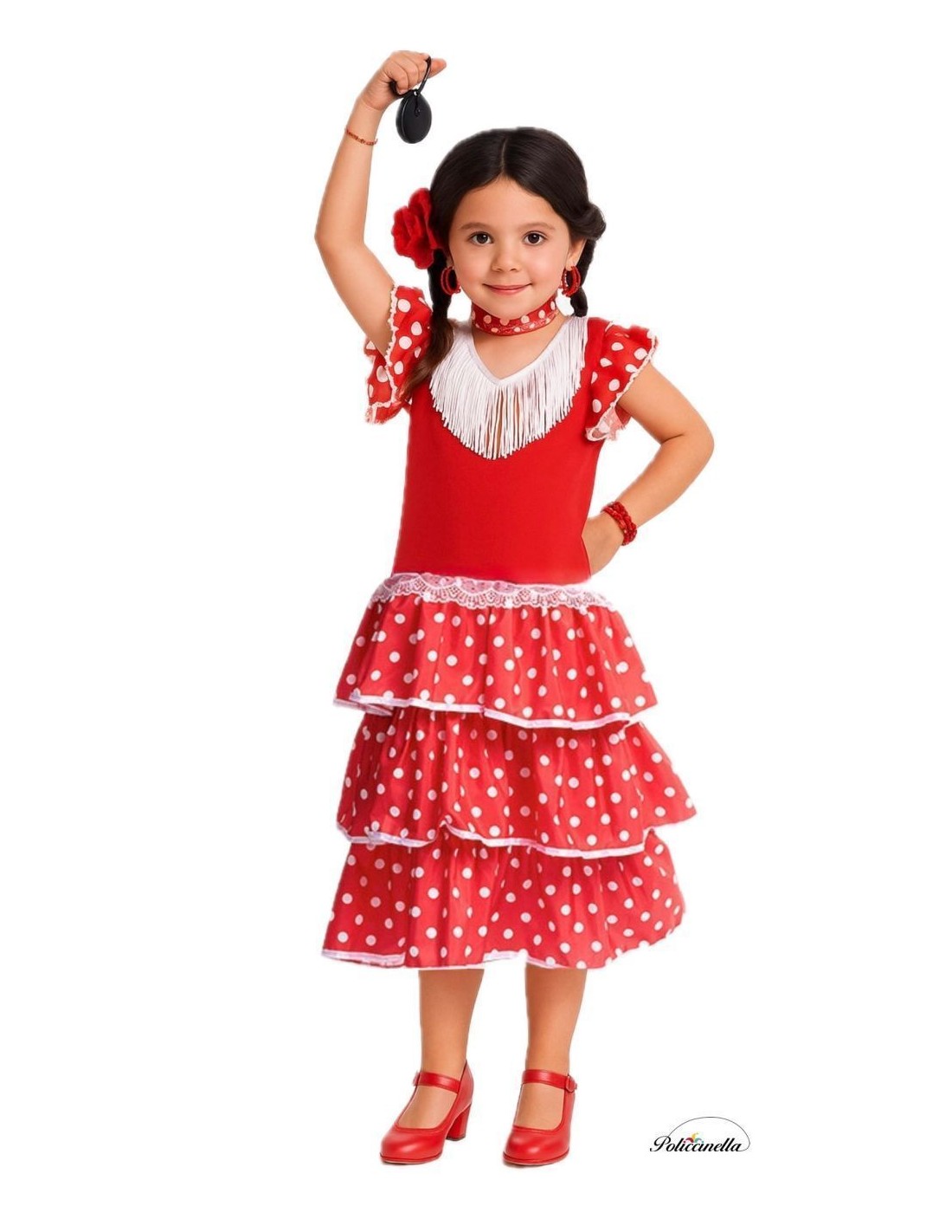 Questo costume da bambina da sevillana riunisce l'essenza del vestito tipico con una confezione comoda, leggera e di alta qualità. Realizzato in maglia semielastica e morbido raso, offre una vestibilità perfetta e libertà di movimento. Il colletto intero presenta i caratteristici frange, mentre i volant in raso, decorati con nastro bianco e pizzo sui fianchi, aggiungono grazia e autenticità. Il gioiello del costume è il suo design tradizionale a pois e colori emblematici, che evocano la gioia del flamenco e delle fiere andaluse. Un vestito resistente, fresco e affascinante, ideale per ballare, giocare e brillare al Carnevale, alle feste scolastiche o alle celebrazioni tipiche.