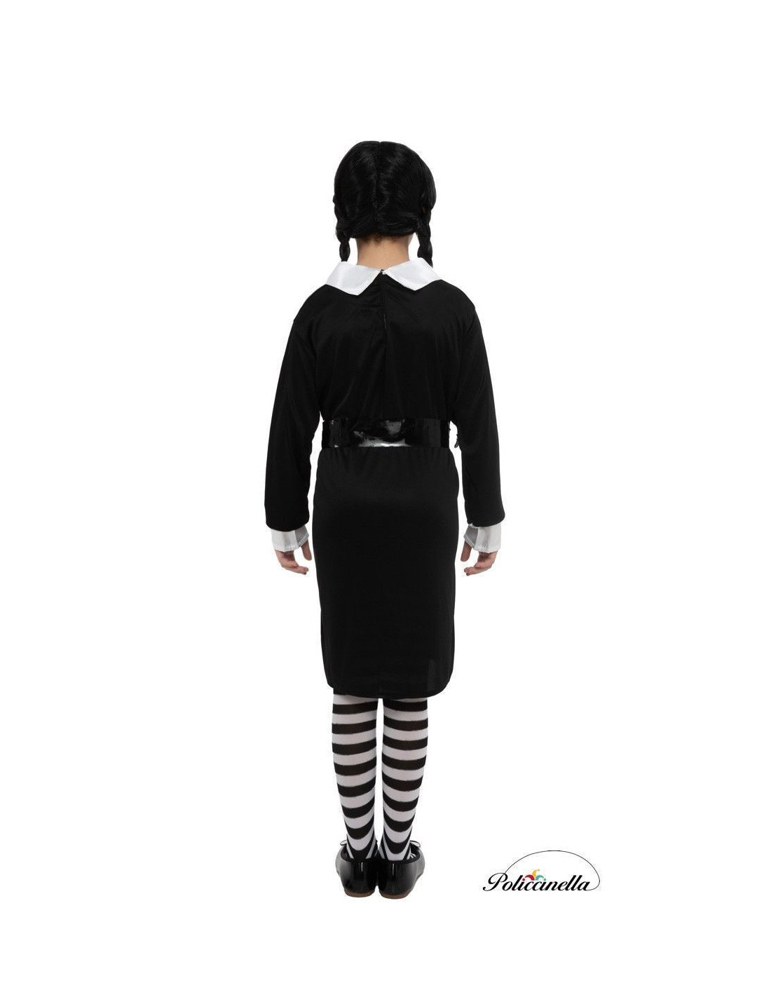 Scopri il fascino unico di questo costume, ideale per distinguersi a Halloween. Realizzato in un elegante punto di maglia, questo vestito nero a maniche lunghe con polsini bianchi ha una texture morbida e leggermente elastica. Il suo taglio classico valorizza la figura. Presenta un impeccabile colletto bianco con bottoni decorativi e una larga cintura che definisce la vita con uno stile gotico, abbinata a calze a righe nere e bianche.