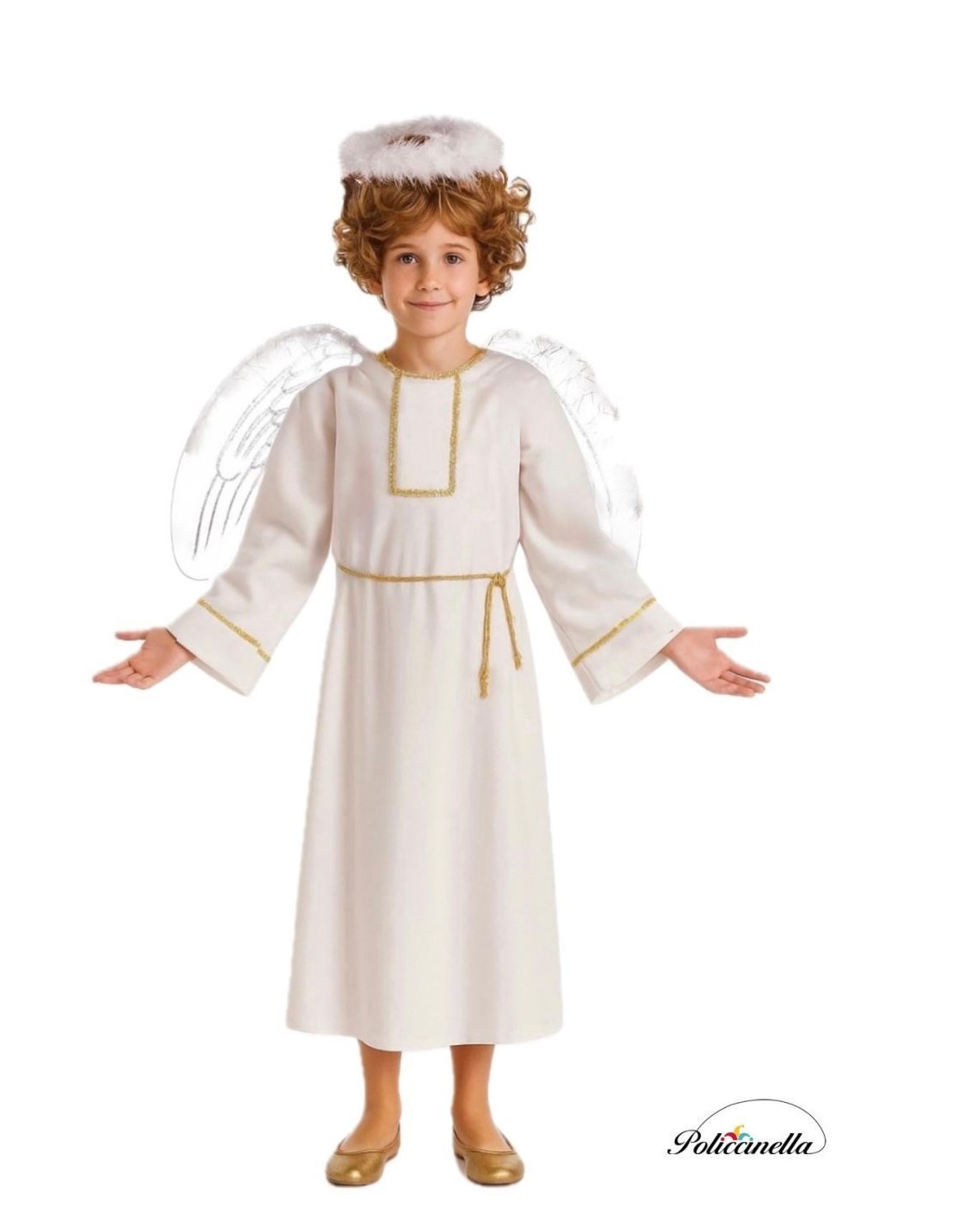 Questo costume di angioletto si distingue per la sua delicatezza, comodità e grande qualità in ogni dettaglio. La tunica lunga, in poliestere al tatto vellutato, ha una linea dritta con elastico sul retro in vita per una vestibilità perfetta e si chiude sul collo con del velcro. È decorata con un'elegante passamaneria dorata sul petto e sulle maniche, insieme a un pezzo di tulle con riflessi dorati che conferiscono un'aria celestiale. Si completa con una tiara coronata da una soffice boa bianca e, soprattutto, con il gioiello del costume: delle spettacolari ali leggere, realizzate in maglia su struttura metallica, decorate con boa e facili da indossare grazie alle loro cinghie elastiche tipo zaino. Un insieme resistente, vistoso e affascinante, ideale per presepi viventi, festival scolastici o celebrazioni natalizie piene di magia.