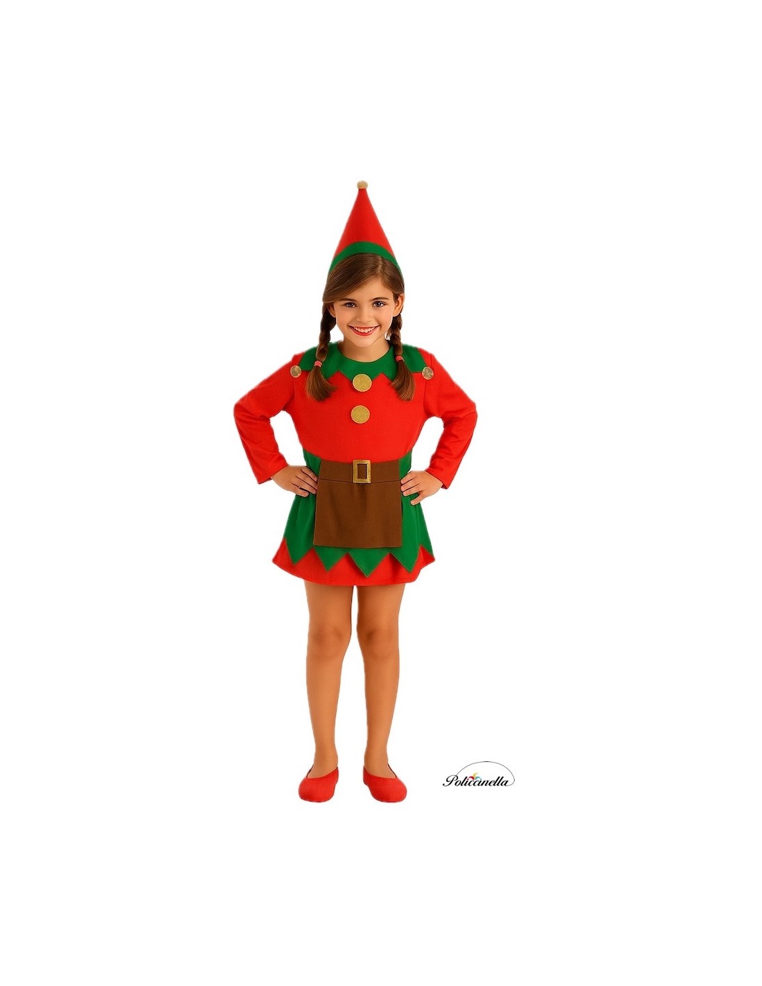 Incantevole vestito in maglia semielastica, morbido al tatto e con vita arricciata per una vestibilità favorevole. Colletto e gonna con texture vellutata, decorati con applicazioni dorate a forma di bottone che aggiungono un tocco luminoso e festoso. Il grembiule marrone, cucito alla gonna, aggiunge un accenno tradizionale al design. Include una cintura di feltro con fibbia dorata fiammeggiante e chiusura in velcro, e un cappello a forma conica con bordo in velluto e decorazione dorata sulla punta. Un set di alta qualità per un'elfa indimenticabile.