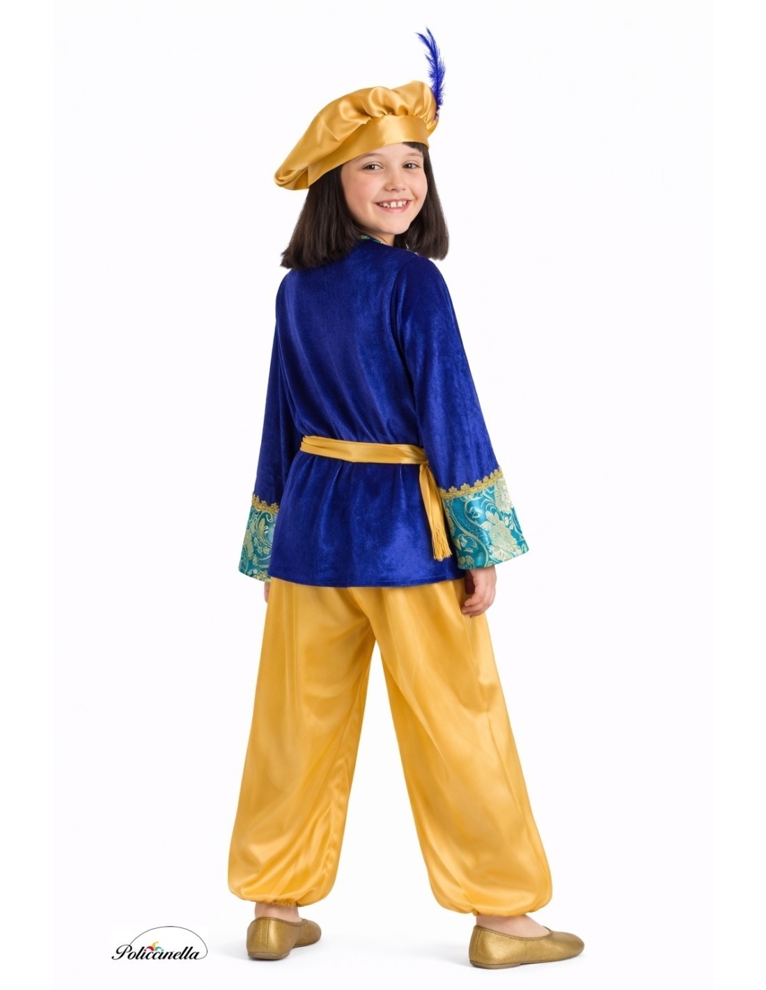 Questo costume da paggio brilla per la sua realizzazione di alta qualità e l'eleganza dei suoi dettagli. La giacca, in velluto blu elettrico dal tocco delicato, si chiude con del velcro al collo e presenta uno spettacolare davanti e maniche decorati con stoffa damascata e passamanerie dorate che conferiscono un'aria maestosa. Il pantalone, in raso dorato, ha dell'elastico in vita e alle caviglie per una vestibilità comoda, mentre la cintura, anch'essa in raso, è decorata con frange dorate che conferiscono distinzione. Il cappello a bombetta, in raso coordinato e con una piuma in cima, completa il set. Il gioiello del costume è senza dubbio il lussuoso damasco della giacca, che conferisce autenticità e nobiltà. Un abito morbido, vistoso e distinto, ideale per sfilate, presepi viventi e celebrazioni natalizie piene di tradizione. "La stampa del tessuto può variare leggermente rispetto a quella mostrata in fotografia, mantenendo sempre la stessa qualità e stile."