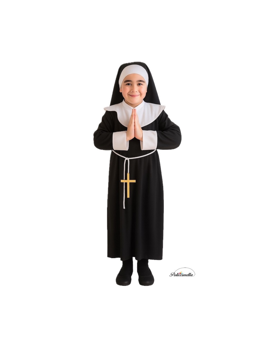 Questo versatile costume include una tunica o cappuccio realizzati in morbida maglia semielastica che offre grande comfort e mobilità. Il capo si adatta con una chiusura in velcro sulla parte posteriore del collo, facilitando la vestizione. I polsini, realizzati in morbido raso, aggiungono un delicato contrasto e un'elegante finitura. Il bavaglio o cuffia bianca, anch'esso in raso, si chiude con velcro per una perfetta e comoda vestibilità. Il copricapo combina tessuti di maglia e raso, regolandosi tramite velcro per adattarsi alla testa senza perdere forma. Un cordoncino di poliestere completa l'insieme, stringendo in vita e completando il look con un tocco classico.