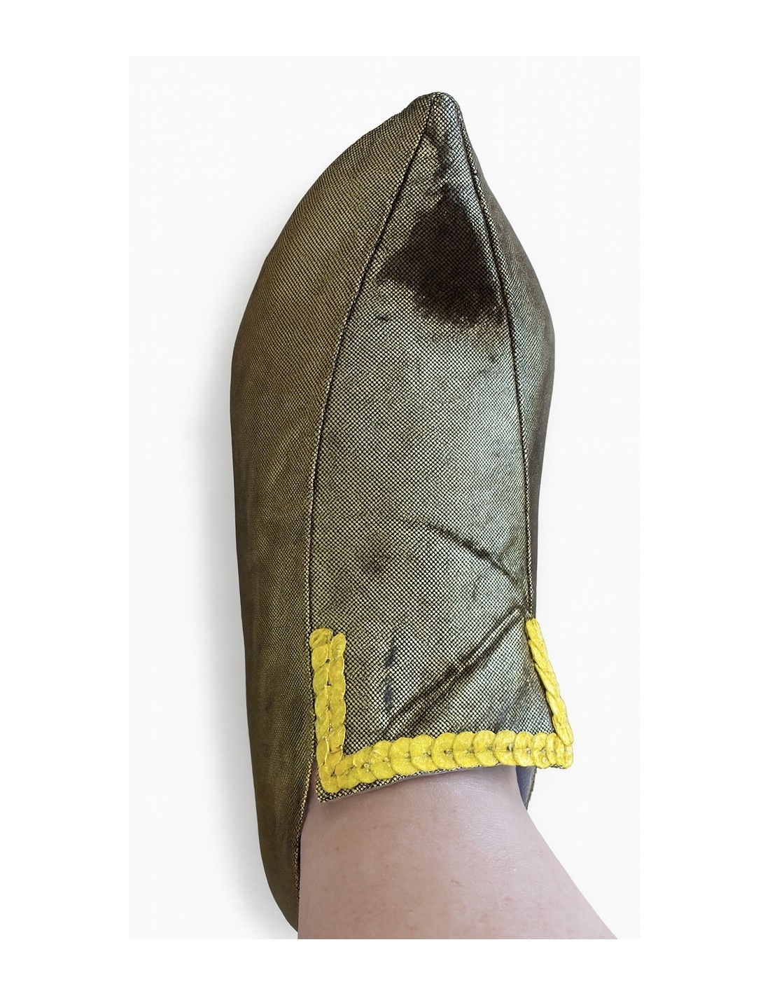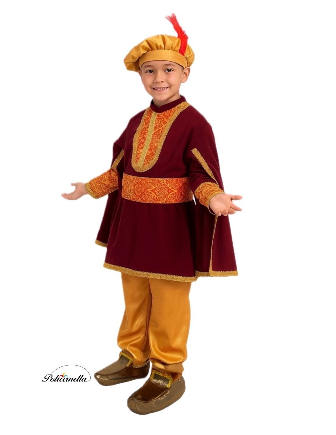 Giacca in tessuto dal tocco amelocotonato combinato con raso stampato sul petto e sulle maniche, con dettagli in passamaneria dorata. Le maniche, a forma di mantello, offrono una maggiore copertura e un'aria più principesca. Allo stesso modo, le pantofole sono decorate con paillettes e il cappello con piuma rossa incorporata. Ha una cintura che si chiude e si adatta con chiusura in velcro e pantaloni dorati con elastico in vita e piccola tasca interna. "La stampa del tessuto può variare leggermente rispetto a quella mostrata nella fotografia, mantenendo sempre la stessa qualità e stile".