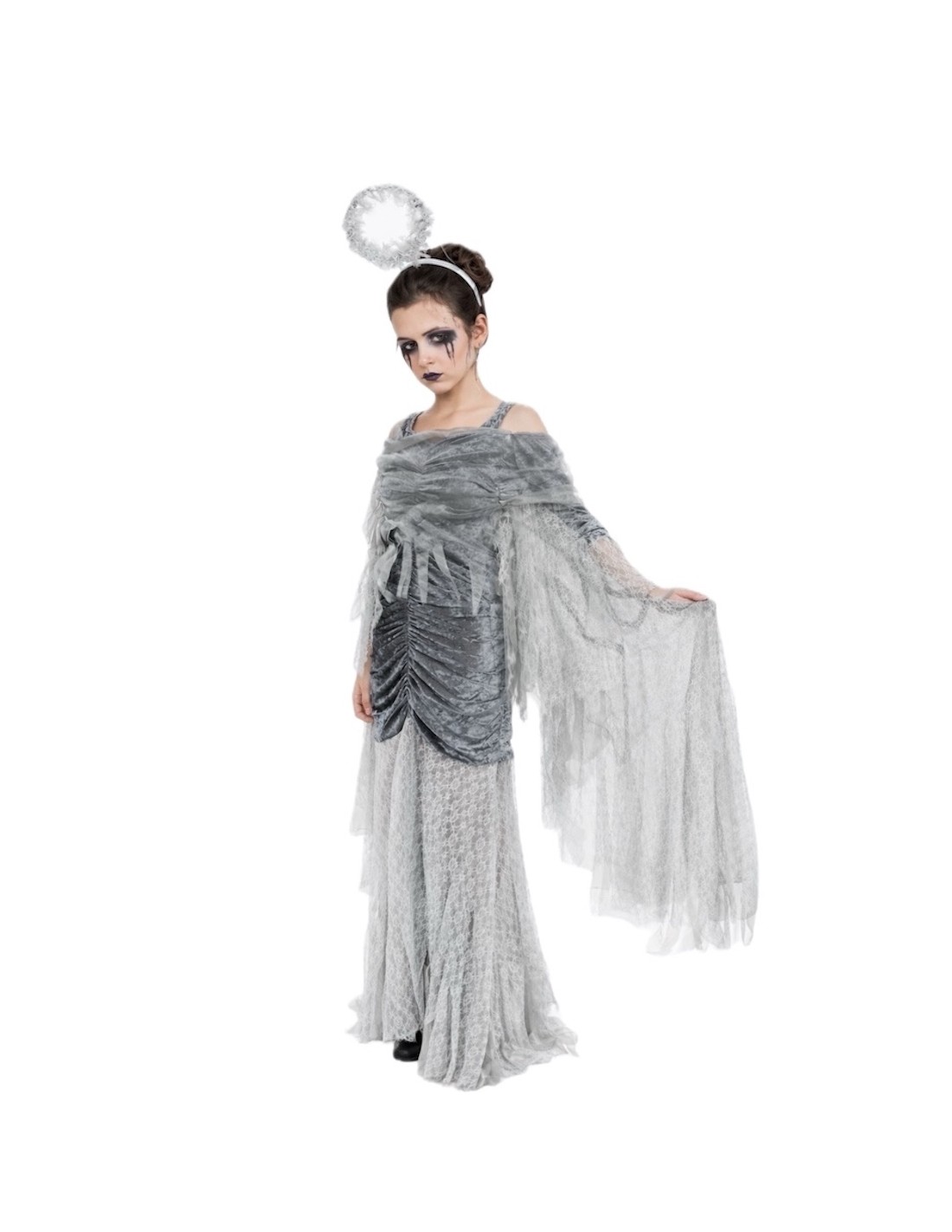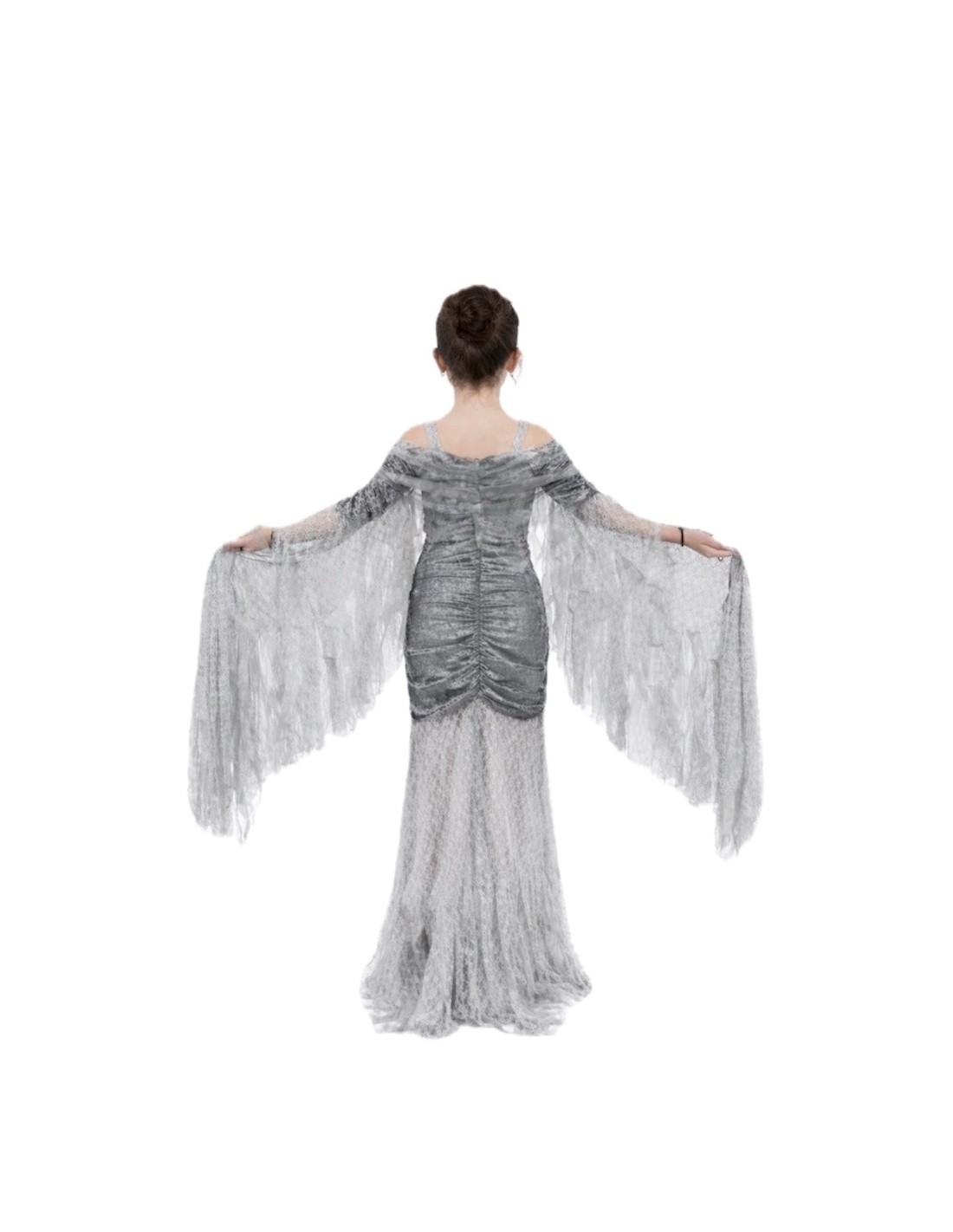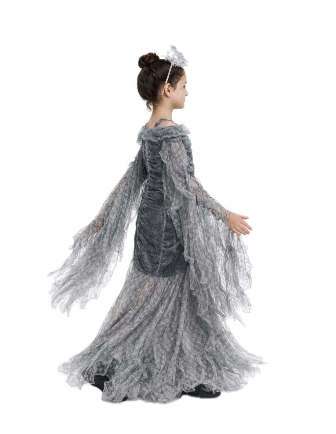 Avvolto in un tocco di mistero e fantasia, questo splendido costume di Angelo Caduto farà sentire ogni bambina magica. Il vestito, realizzato in morbido velluto drappeggiato e leggermente elastico, si adatta comodamente a diverse silhouette, offrendo libertà di movimento e una vestibilità incantevole. Le lunghe ali, cucite lungo le maniche, si aprono e si chiudono con il movimento delle braccia, come se potesse davvero volare! Una spallina in chiffon regolabile aggiunge un tocco delicato, mentre la gonna di pizzo e chiffon, leggera e non trasparente, crea un effetto vaporoso ed elegante. Un completo pieno di stile, mistero e divertimento celestiale.
