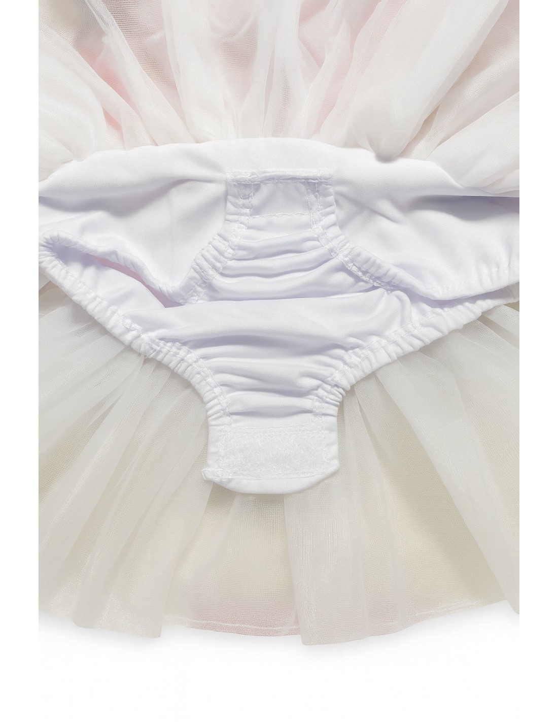 Questo spettacolare body con gonna incorporata unisce brillantezza, comfort ed eleganza in un design ideale per il palcoscenico. Il corpo presenta una delicata rete sullo scollo e un tessuto a maglia con paillettes incastonate che conferiscono un finish luminoso. La gonna di tulle con volant include un bordo semirigido di crinolina su ogni strato per ottenere il volume perfetto. Si distingue per la mutandina aperta con chiusura in velcro, che facilita il passaggio al bagno con totale comodità. Sul retro, si chiude al collo con velcro, lasciando parzialmente scoperta la schiena. Completo di fermaglio per capelli abbinato. Ideale per brillare in qualsiasi esibizione.