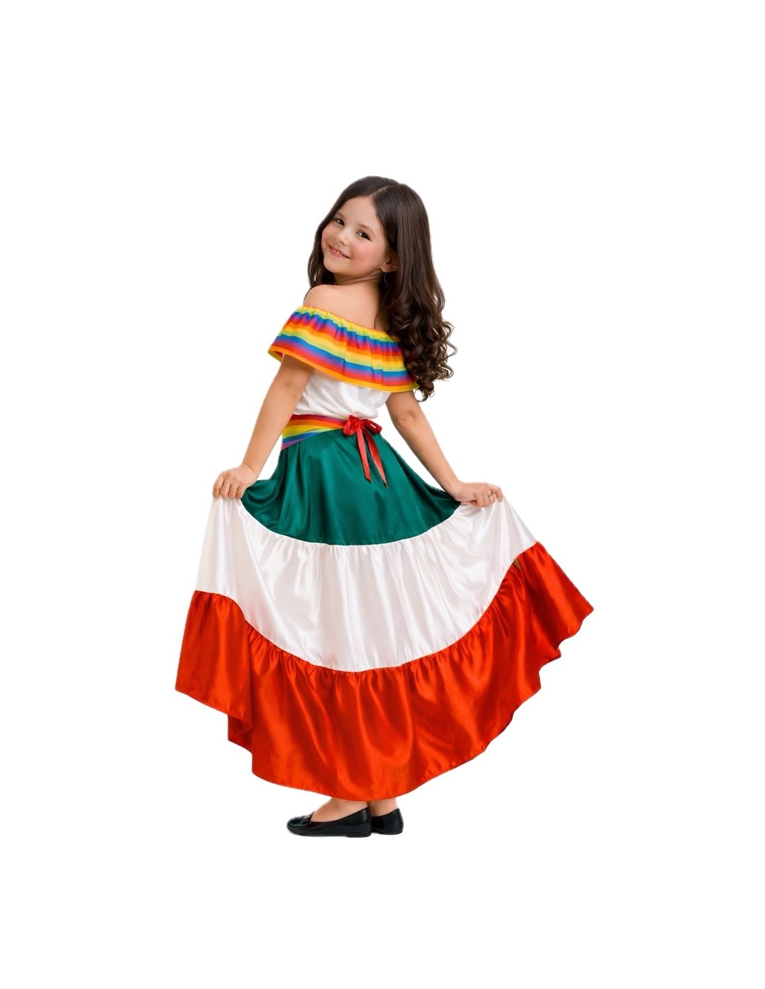 Un vestito pieno di colore e allegria, ispirato alla tradizione messicana. Realizzato in morbido raso, presenta un elastico in vita per una vestibilità comoda e un collo a barca o bardot, anch'esso elastico, che valorizza la silhouette e garantisce una buona aderenza. Le maniche sono decorate con nastro ondulato e presentano un elastico per adattarsi con grazia al braccio. Lo scollo è ornato da un vivace volant multicolore, che conferisce movimento e un'atmosfera festosa molto caratteristica. In vita, una cintura multicolore annodabile completa l'insieme, definendo la figura e rafforzando lo stile tradizionale. Un bellissimo costume, comodo e molto vistoso, ideale per feste a tema, Carnevale o rappresentazioni culturali.