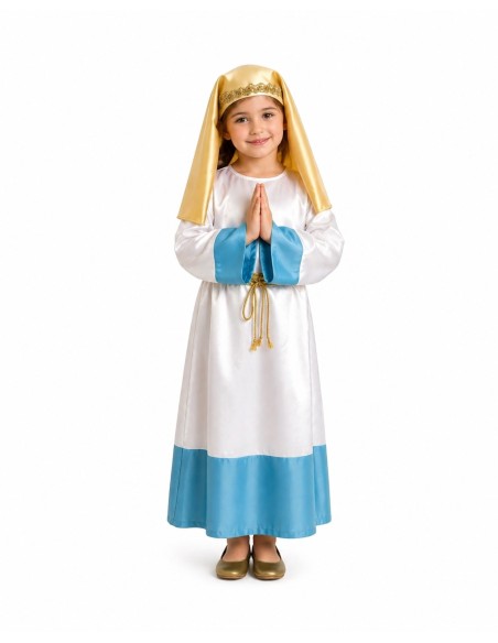 Costume di alta qualità della Vergine Maria, ideale per rappresentazioni natalizie ed eventi religiosi. Include una tunica in raso morbido, con chiusura sul retro del collo tramite sistema di velcro e una cintura realizzata in raso con una bella passamaneria che esalta la figura. Il velo, anch'esso in raso e decorato frontalmente con passamaneria, si adatta comodamente alla testa grazie alla sua gomma interna, garantendo che rimanga al suo posto.