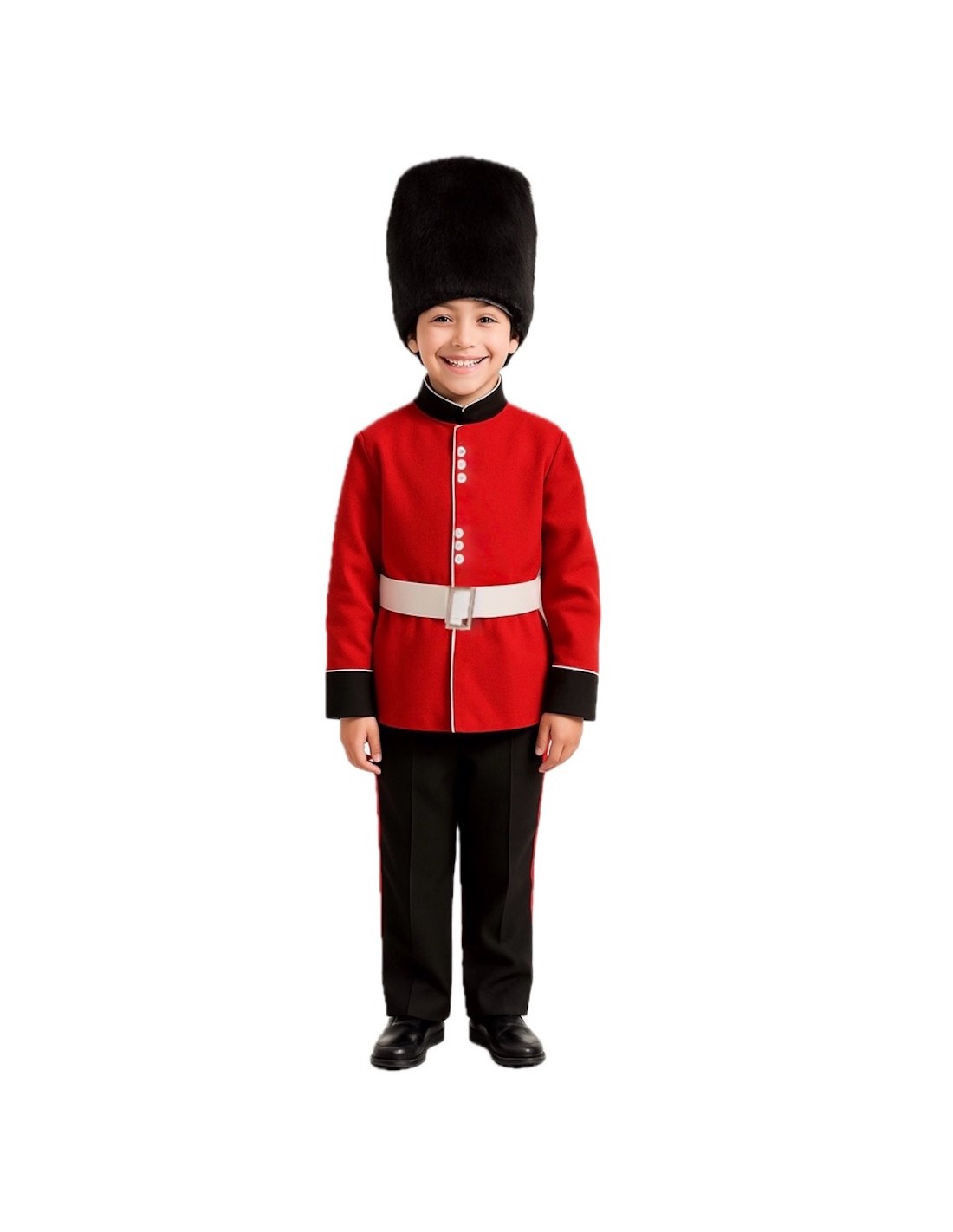 Classico costume della Guardia Inglese, elegante e con tutti i dettagli dell'uniforme tradizionale. Include una giacca di poliestere fitto ma morbido con collo alla coreana, decorato con nastri bianchi e bottoni, con chiusura a strappo sul retro del collo. I pantaloni, in morbido tessuto semielastico con elastico in vita, presentano un nastro di raso rosso sui lati. Si completa con una cintura lucida con fibbia di plastica argentata e il caratteristico cappello con pelo sintetico che caratterizza il personaggio, realizzato su un tessuto a maglia, con elastico nella parte posteriore per poterlo adattare comodamente.