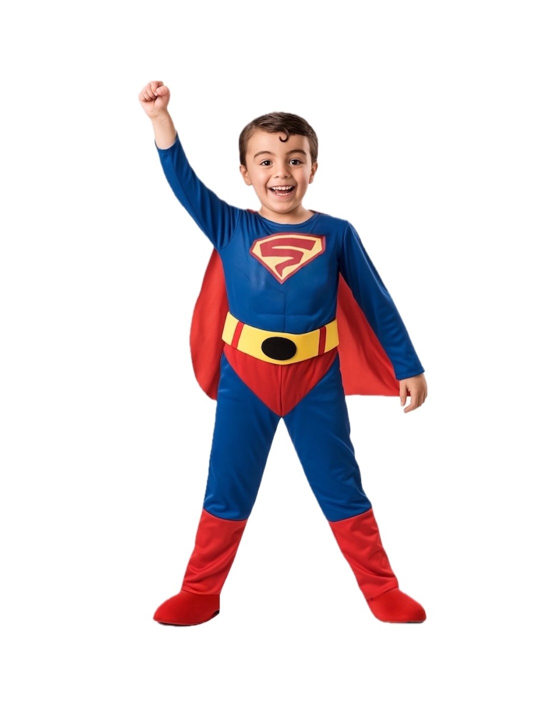 Questo costume da supereroe consiste in una tuta intera realizzata in morbido punto di maglia. Include una sezione anteriore che simula gli addominali, riempita con fibra di poliestere per volume e realismo. Il fondo dei pantaloni, in rosso, e il grembiule, entrambi dello stesso tessuto della tuta, includono una zip nascosta per una maggiore comodità. Aggiungi una mantella, dello stesso tessuto della tuta, con chiusura a strappo. Viene aggiunta una cintura in punto di maglia giallo schiumato, con design caratteristico, che si chiude con velcro sul retro. La chiusura del costume è sul retro con una zip nascosta.