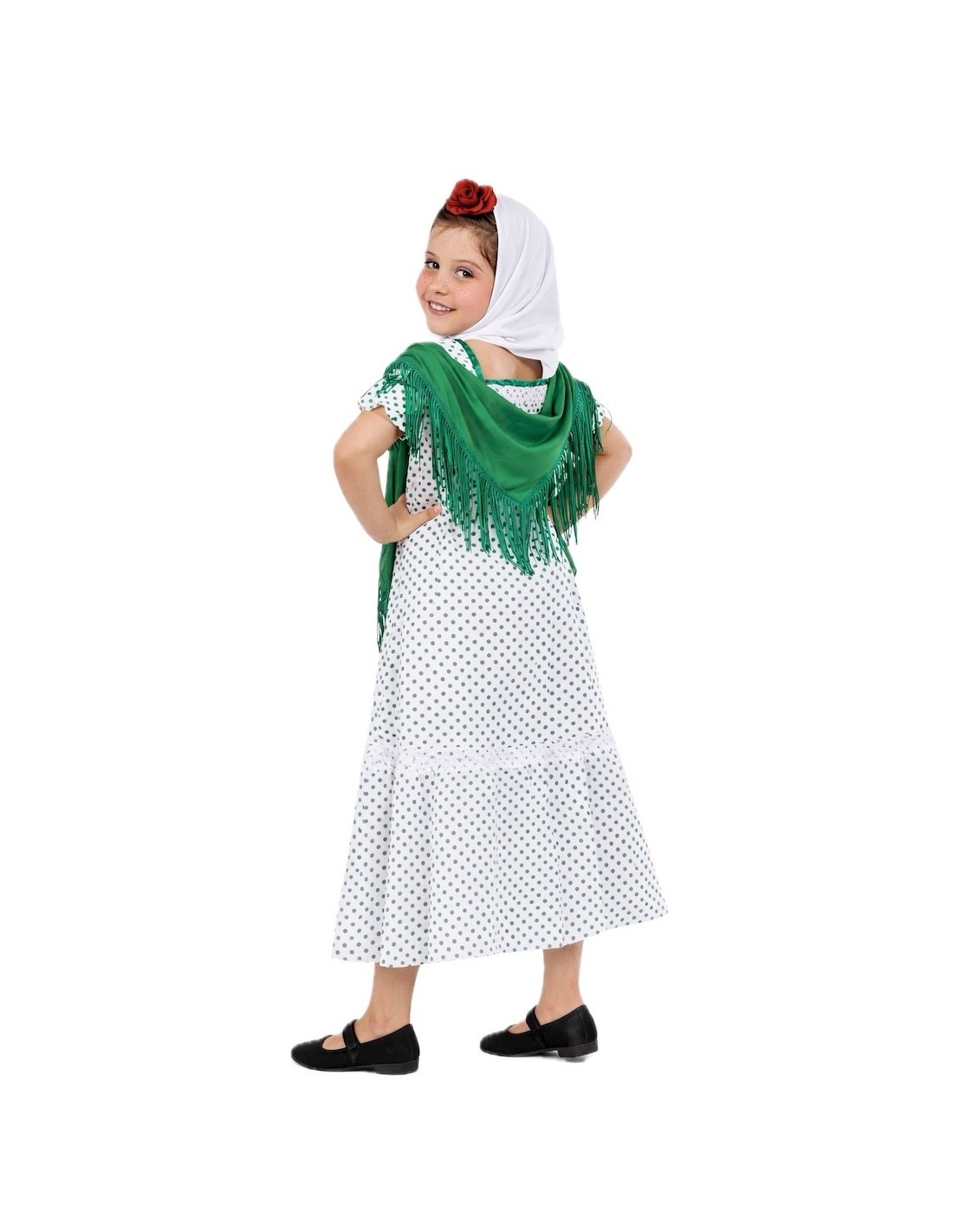 Tradizionale e castizo vestito da chulapa, confezionato in morbido raso con collo quadrato e chiusura a strappo sulla nuca. Elastici sul retro e sui lati esaltano la figura con comfort. Decorato con nastro e fiocchi di raso abbinati ai pois e un delicato pizzo. Le maniche hanno elastico per una vestibilità perfetta. Include una sciarpa per la testa e il classico scialle in morbido tessuto di macchina con frange, per completare questo incantevole ensemble madrileno.
