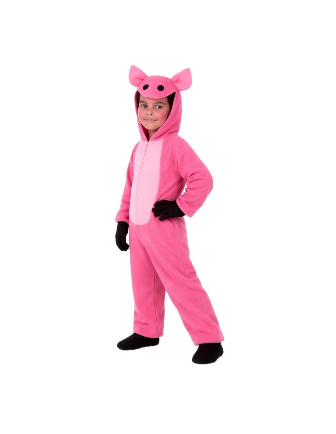 Adorabile costume da maialino con tuta intera, realizzato in tessuto simile a peluche dal tocco super morbido e piacevole, con una cerniera invisibile sul davanti. Il cappuccio integrato, dello stesso materiale, è imbottito per mantenere la sua forma, con occhi e naso in feltro fitto attaccati. Sul retro, la simpatica coda arricciata ha un filo interno per plasmarla e conservarne la forma. Leggero, comodo e con finiture di alta qualità.