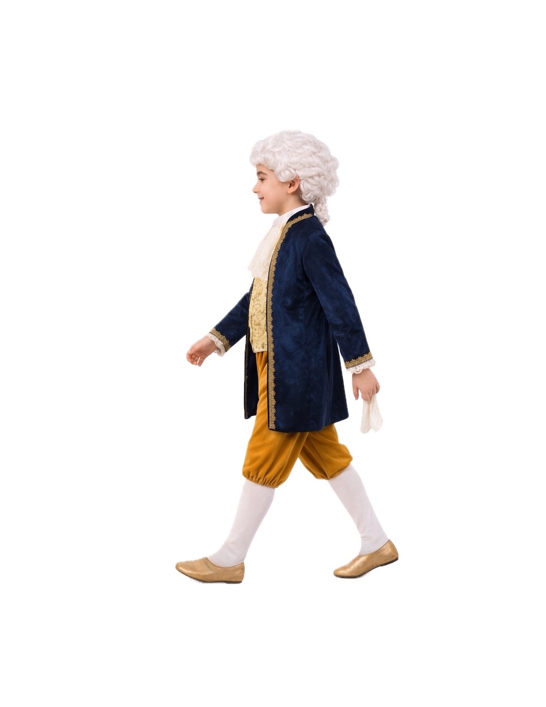 Costume in stile Luigi XV composto da frac, pantaloni corti e fazzoletto da collo. Il frac unisce velluto fitto con poliestere stampato tipo broccato dorato, decorato con passamaneria dorata e pizzo bianco ai polsini. Chiusura anteriore con velcro nascosto per facilitarne l'uso senza alterare l'estetica. I pantaloni, in raso lucido, includono vita e fondo elasticizzati per maggiore comfort, oltre a una tasca interna funzionale. La lunghezza, sotto il ginocchio, mantiene la fedeltà storica. Il fazzoletto di pizzo bianco completa il look con coerenza ed eleganza.