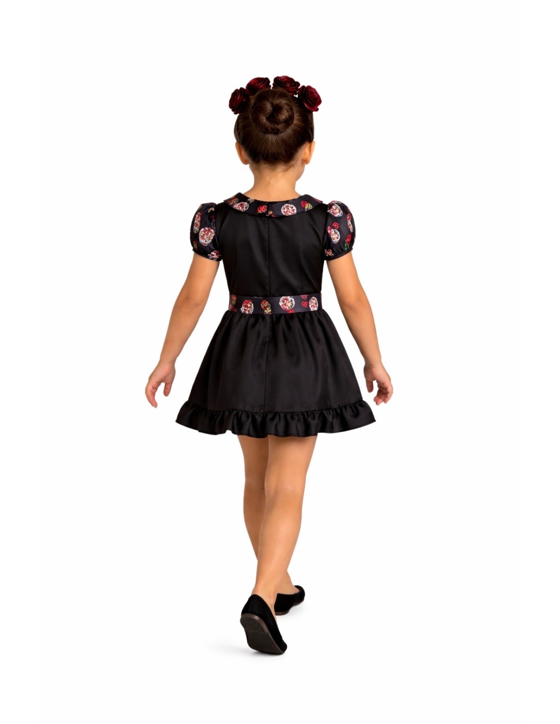 Un elegante e originale costume con un vestito a corpo realizzato in morbido tessuto semielastico a maglia, decorato con ossa dipinte (non fluorescenti). Chiusura posteriore con velcro sul collo per maggiore comodità. Colletto e maniche in raso con delicata stampa floreale e di teschi e gonna in raso con svolazzante volant sul fondo. Vita e maniche elasticizzate per una vestibilità perfetta. La cintura è realizzata su un pezzo di TNT per dare corpo e struttura al capo. Un set leggero con dettagli curati per brillare con stile e tradizione.