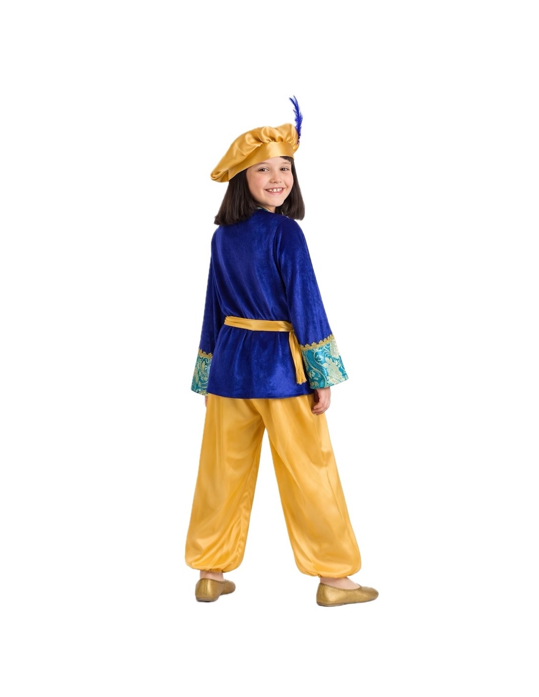 Questo costume da paggio brilla per la sua realizzazione di alta qualità e l'eleganza dei suoi dettagli. La giacca, in velluto blu elettrico dal morbido tatto, si adatta al collo con del velcro e presenta uno spettacolare davanti e maniche decorati con un tessuto in broccato damascato e passamanerie dorate che gli conferiscono un'aria maestosa. I pantaloni, in raso dorato, hanno elastico in vita e alle caviglie per una vestibilità comoda, mentre la cintura, anch'essa in raso, è decorata con frange dorate che conferiscono distinzione. Il cappello bombato, in raso coordinato e coronato da una piuma, completa l'insieme. Il gioiello del costume è senza dubbio il lussuoso broccato della giacca, che conferisce autenticità e nobiltà. Un abito morbido, vistoso e distinto, ideale per sfilate, presepi viventi e celebrazioni natalizie ricche di tradizione. "Il disegno del tessuto può variare leggermente rispetto a quello mostrato nella fotografia, mantenendo sempre la stessa qualità e stile".