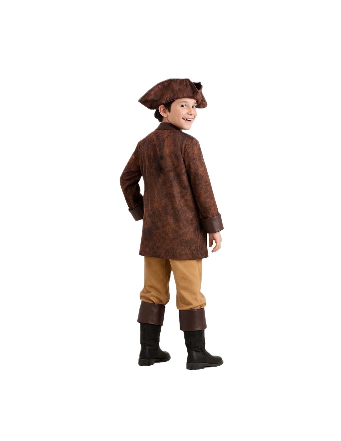 Questo costume si distingue per la cura dei dettagli e la qualità di ogni capo. La giacca lunga di tipo levita, realizzata in tessuto effetto pesca con effetto pelle, presenta revers e polsini strutturati su base di TNT, decorati con pezzi dorati cuciti e bottoni dorati in plastica con finitura metallica. Ha una fascia posteriore per una vestibilità comoda. La finta camicia in morbido maglione a macchina include un volant sul collo, chiusura a strappo sul retro e regolazione con lacci. È accompagnata da fasce strutturate in TNT che si regolano con chiusura a strappo, simulando una cintura e un ornamento frontale. I pantaloni in tessuto effetto pesca, con vita elastica e tasca interna, presentano orli rigidi per coprire lo stivale effetto pelle.