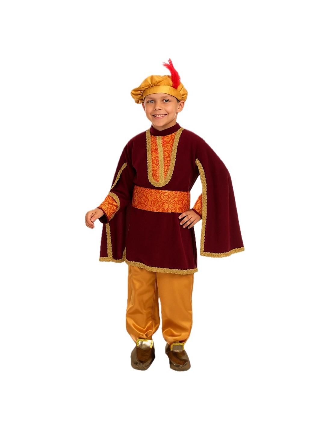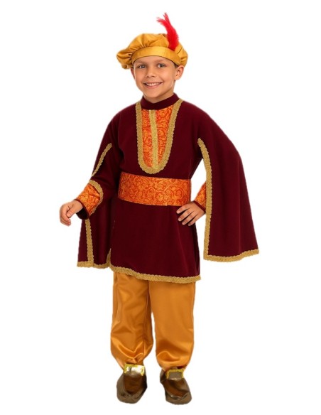 Giacca in tessuto dal delicato tocco di amelocotone abbinato a raso stampato sul petto e sulle maniche, con dettagli in passamaneria dorata. Le maniche, a forma di mantella, offrono una maggiore copertura e un'aria più principesca. Allo stesso modo, le pantofole sono decorate con paillettes e il cappello con piuma rossa incorporata. Include una cintura che si chiude e si adatta con chiusura in velcro e pantaloni dorati con elastico in vita e piccola tasca interna.