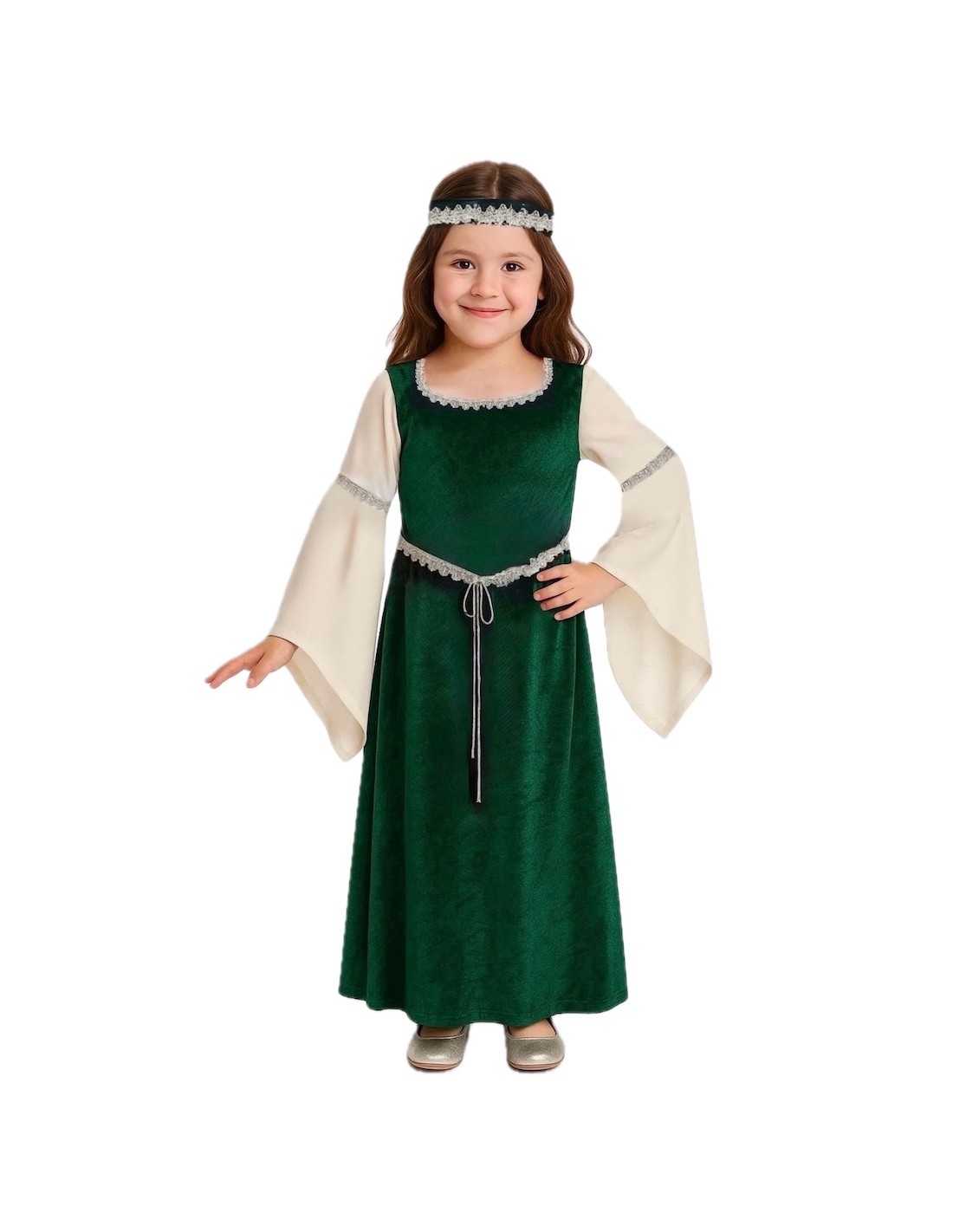 Esta bela fantasia medieval, confeccionada em veludo macio e malha, é composta por um vestido longo verde garrafa, com decote em caixa e mangas compridas medievais que alargam a partir do cotovelo. Na cintura, possui um laço para ajustar atrás e adaptar-se à figura. A fantasia está adornada com passamanaria prateada no pescoço, mangas, cintura e turbante, que por sua vez apresenta um elástico na parte de trás para melhor ajuste à cabeça.